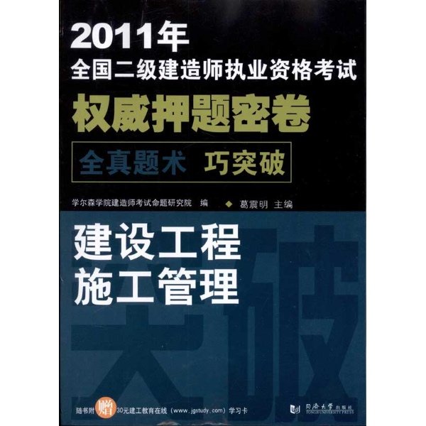 建造师应试者大多工作紧张繁忙,为了使应试者能在有限的学习时间内,更有效地进行复习,有针对性地理解和掌握各门应考课程的重点内容,学尔森学院特组建“建造师考试命题研究院”,举全院之力,根据最新考试大纲,重点分析必须掌握的知识点和历年必考的难点,与同济大学出版社共同策划出版“2011年全国二级建造师执业资格考试权威押题密卷”丛书,帮助应试者快速掌握建造师执业资格考试各科目考试的要点、难点、题型和考试技巧等。本套丛书包括《建设工程施工管理》、《建设工程法规及相关知识》、《建筑工程管理与实务》、《机电工程管理与实务》和《市政公用工程管理与实务》等5种图书,分别对应于相应的考试科目,每种书中均包括建造师资格考试心得与技巧、模拟测试题及参考答案、近几年全真考试试题及参考答案等三部分内容,应试者可针对报考的科目选用。