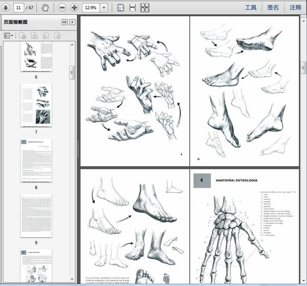 本章节所示的图和前几页一样,都是採用相同的技法(使用H、HB和B石墨铅笔,画在24×33cm(9□×13in)的粗糙纸面上),在每一页绘出单手或单脚。这是我精心的安排,因为我故意侷限自己,绘出一系列在解剖学姿态学观点上,具有高度研究趣味的各种姿势(由无数可能的姿势里挑出),而不是绘出没有区别的临摹范例。不过这些图仍可以啟发你,用相同或类似的位置来表现你自己的手或脚,或是模特儿的手或脚,并以不同的观点或不同的灯光状态来研究他们。