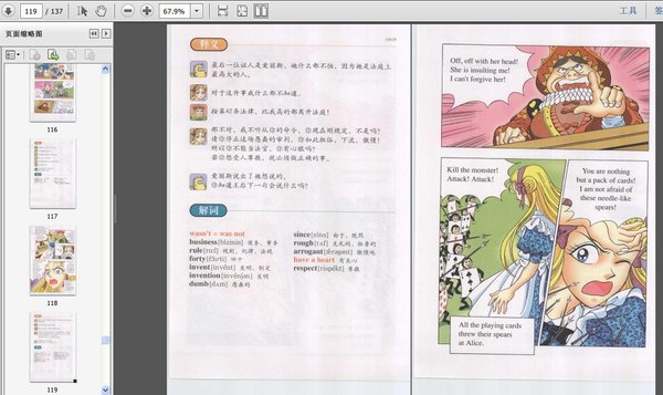 五、《爱丽斯漫游仙境》讲述了一个名叫爱丽斯的小姑娘跟随一只穿礼服的红眼兔子漫游仙境的故事。为了激发孩子们的阅读兴趣,本书将这一世界名著改编成漫画。