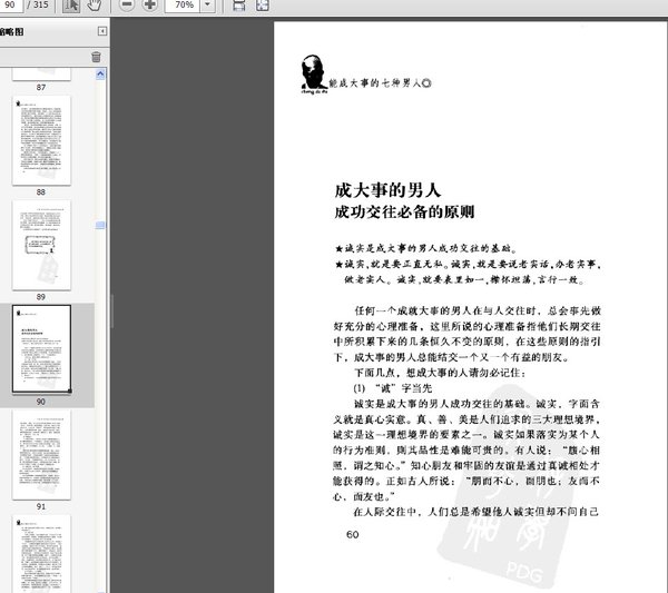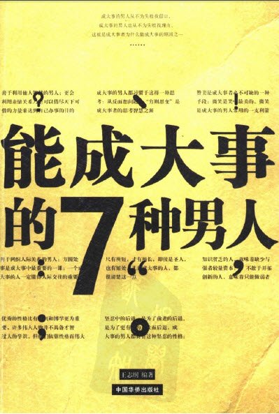 : 能成大事的7种男人 第一章善于利用他人智慧的男人能成大事 善待属下,利用他人的智慧成就霸业 力量不足,借人成事 善借他人之力成就自己 借助整个天下的力量 运用亲情的能力 刘备:借助他人的智慧撑起一片天 元太祖的点石成金术 孟尝君:善用鸡鸣狗盗者 第二章善于网络人际关系的男人能成大事 方圆处事,是成大事中最重要的一课 社交需要自己推销自己 看客上菜,体现说话技巧 尊重是交际的桥梁
