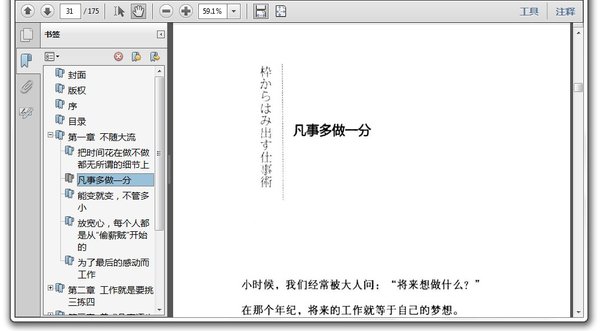 : 序 第一章 不随大流 把时间花在做不做都无所谓的细节上 凡事多做—分 能变就变,不管多小 放宽心,每个人都是从“偷薪贼”开始的 为了最后的感动而工作 第二章 工作就是要挑三拣四 把“不喜欢”与“喜欢”搭配着来做 别用公司统一配给的文具 用最简洁的方式解决你讨厌的工作 知道≠实践 模仿自己讨厌的人 专业人士就要改变自我 第三章 养成凡事逐步分解的习惯 在失败中寻找“意外收获” 做一本“错误笔记” 用“虚拟决策权”,工作自己做主 下一步工作的提示就在眼前的工作中 第四章 记录工作的“足迹” 分享达成目标的过程比统一目标更重要 传播“自己想知道的事” 保存心灵燃料的“美崎博物馆” 不要隐瞒自己的努力 不求回报 第五章 积极展现自己的“独门秘诀” 上班族成为作家的原因 不要将无法预测的东西当做目标 借别人的招牌 新结识的人=未来的好友 通过交流,找到工作的乐趣 不断给自己布置作业 后记