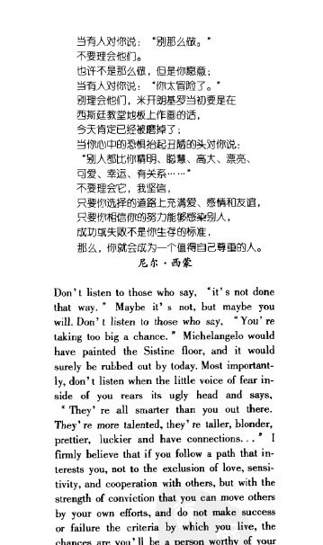 本书是一本激励人奋斗、前进的丛书。书中图文并茂,英汉对译。每一句格言都有其独特的内涵和意义。从中吸取经验、方法。引导事业走向成功的尽头。在这个时刻都想把你同化的世界,保持自我便宛如进行一场人类历史上最惨烈的战斗,但决不要放弃战斗。你挣扎着,企图保持自我本色,那是一场最艰以的战斗,可人人都没有停止过。