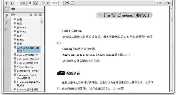 《愤怒的英语:英语这样说才不会出洋相》是一本帮助中国人解决英语常见错误的方案汇编书籍。作者韦伯以在华六年的亲身体验,用轻松有趣的方式列出中国人经常用错的英语,同时保持了一种严谨的态度和专业的眼光;其内容涵盖日常口语、书面写作、 商务合同、邮件往来等诸多方面,帮助读者揭露无意识中犯下的英语错误,体会英语的语言习惯和文化特点,彻底摆脱错误。