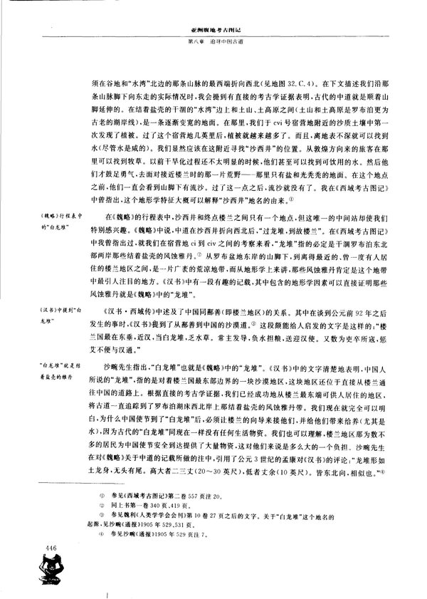 《亚洲腹地考古图记》是一部大型考古报告,是斯坦因1913年7月至1916年2月,历时2年8个月、行程11 000英里,东迄河西走廊,经新疆塔里木盆地,西至阿姆河上游和伊朗;南自兴都库什山,经准噶尔,北达内蒙古西部地区,在这一时空范围进行的考古调查、发掘资料及研究成果。《亚洲腹地考古图记》记载了作者所考察的古代遗址、墓地、道路遗迹与所发现的大量重要文物。其中重要遗址和墓地有麻扎塔格山废堡遗址、尼雅遗址、鄯善“东故城”佛寺遗址、楼兰古城遗址、汉代长城及烽燧遗址、吐鲁番佛寺遗址和墓地以及从瓦罕经加兰、罗申、舒格楠至达尔瓦孜沿途的古老堡垒遗址,还有锡斯坦的科赫依瓦贾圣山上的萨珊遗址及其南部的史前遗址等。关于古代道路的考察,发现颇多,如穿过达丽尔和丹吉尔山谷的中印古代佛教交流之路、喀拉塔仁什河首次探察的古道、从罗布泊到疏勒河的重要古代通道、塔里木盆地北边的古代文献所载之“北道”及其绿洲、从喀什穿越俄属帕米尔和阿姆河上游所路经的古代丝路等。在上述古代遗址附近和道路沿线发现了大量重要文物,如藏文文书、卢文木简、佛寺壁画、丝绸、汉文木简和佛教经卷,党项文、藏文手稿和雕版印刷品等。古代墓地出土的遗物,主要有萨珊时期、伊斯兰时期的文物,以及史前时期的石器和彩陶,还有用于体质人类学研究的400多个古人骨骼标本等。这些考古遗迹、遗物的重要性是显而易见的,它们成为研究新疆、中亚考古与历史,探索古代丝绸之路的弥足珍贵的科学资料。20世纪许多与此相关的“新学问”的建立,无不与这些新材料的发现有着直接关系。