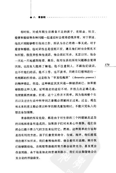 : 译者序 一 生活的意义 二 心灵与肉体 三 自卑感和优越感 四 早期的记忆 五 梦 六 家庭的影响 七 学校的影响 八 青春期 九 犯罪及其预防 十 职业 十一 人及其同伴 十二 爱情与婚姻 阿德勒年谱