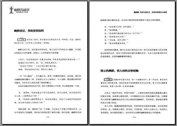 幽默是一种智慧,是一种聪颖,是一种机敏。幽默是一种才华,一种力量,是一种艺术。幽默是引发喜悦和快乐的源泉,幽默是协调自我和社会关系的灵丹妙药。凡是幽默的人,无不具备一种俯瞰茫茫人世的洞察力。一个风趣幽默、具有出众口才的人,不管是人际沟通、商业谈判、职场演说、还是谈情说爱,都会让人们刮目相看,不管在什么地方都能成为人们所关注的焦点。学会了幽默沟通的方法,我们在跟人交往时就能够如鱼得水,在轻松一笑中解除一天的烦、累,让言辞多趣味,幽默到心田,我们的人生也会拥有更多的乐趣和成功。
