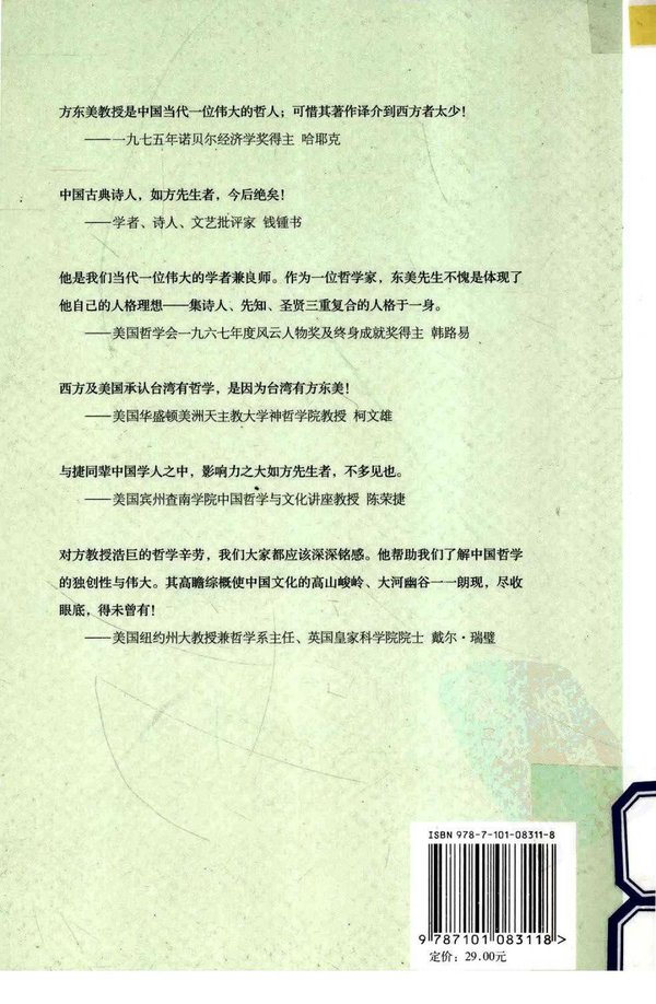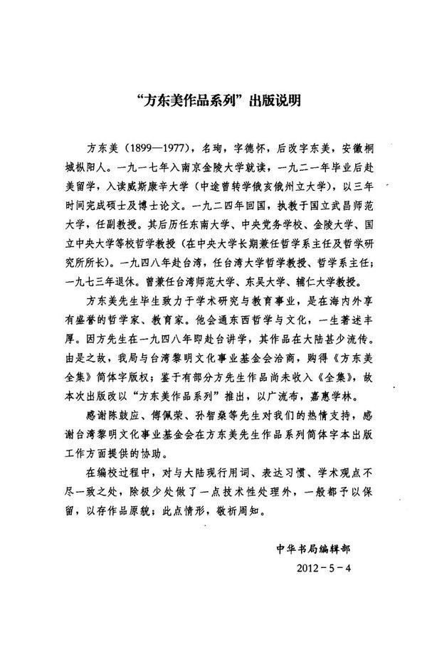 方东美(1899-1977)名珣,字德怀,后改字东美,曾用笔名方东英,安徽桐城人。   方东美以弘扬中华文化的精神价值为学术主旨,始终能以开放的胸襟对待中国传统文化的各种思想流派,并力图贯穿古今,统摄诸家之学。   他曾自我评价,从家庭传统来说他是一个儒家,从气质上说他 是一个道家,从宗教启示上说他是一个佛教徒,从教养上说他是西方的。他把原始儒家、原始道家、大乘佛学、新儒学看成中国哲学的四大传统。   方东美与哲学家方以智、桐城派始祖方苞有旁系宗亲关系,(并非方以智、方苞直系后裔)。方东美年幼丧父母,依赖兄长抚养成人。十六岁毕业于桐城中学。1920年毕业于金陵大学。1921年赴美留学,获威斯康辛大学哲学硕士学位。   1924年通过博士学位考试后回国,任职于武昌大学(武汉大学前身)。1925年应聘东南大学(中央大学前身)教授,学校几经更名,几易校长,方东美一直执教于中央大学。   1948年任台湾大学哲学系主任。如果仅以治学方向的变更来区分其一生的话,方东美大体上 相关图片走过了3个阶段:1936年夏以前为第一阶段,由受中国文化、尤其是儒家文化的熏陶而走向对西方哲学的追求,其代表作为《生命情调与美感》、《科学哲学与人生》;1966年夏以前为第二阶段,由西方逐渐返回到东方,代表这个阶段成就的著作是《哲学三慧》;1966年夏以后进入第三阶段,其主要代表著作为《中国形上学中之宇宙与个人》、《从宗教、哲学、与哲学人性论看人的疏离》、《中国哲学精神及其发展》。方东美始终以弘扬中华文化的精神价值为学术主旨,以开放的胸襟对待中国传统文化的各种思想流派,并力图贯穿古今、统摄诸家之学。   方东美不同意宋儒所强调的“道统论”。他认为现代世界因高度物质化而丧失了宗教精神和哲学智慧,主张落实儒家的人生价值,以不断提升生命的意义,从而达到拯救现代人类的目的。