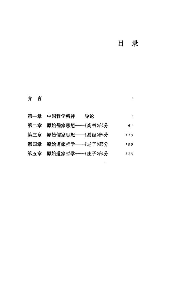 : 弁言 第一章中国哲学精神——导论 第二章原始儒家思想——《尚书》部分 第三章原始儒家思想——《易经》部分 第四章原始道家哲学——《老子》部分 第五章原始道家哲学——《庄子》部分