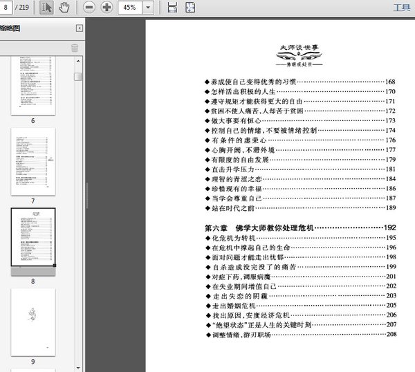 : 第一章 佛学大师教你为人之道 ◆学佛就是学做人 ◆学佛是为大众谋幸福 ◆广结善缘,自谦而尊人 ◆用慈悲心来软化他人 ◆不要忘了基本精神 ◆识人之道 ◆拒绝是一种艺术 ◆退即是进,与即是得 ◆好人不寂寞,善人最快乐 ◆做人低姿态,做事高水平 ◆为学定要深心 ◆恬淡是养心第一法 ◆时时处处助人利己,时时处处你最幸福 ◆身苦心不苦 ◆走出老年的悲哀,服务奉献社会 ◆理解对方,反省自己 ◆生儿女易,教儿女难 ◆圣人之善,以孝为端 ◆要尊重并体会到对方是一个独立人格 ◆顺法调御,以爱教导 ◆进步不落后,圆融不极端 ◆不仅事情要做好,人的本分也要做好 ◆做好自我情绪管理 ◆与人交往须带三分侠义心 第二章 佛学大师教你享受生活 ◆享受是一种礼貌、隆重的表示 ◆会善用时间,就是会处理生命 ◆闲时吃紧,忙里悠闲 ◆重新拾回天空的宁静 ◆没有智慧的头脑,就像没有蜡烛的灯笼 ◆把“难”字从口边,从心里去除 ◆白开水虽淡,可淡有淡的味道 ◆生死疲劳,从贪欲起;少欲无为,身心自在 ◆养深积厚,成就必高 ◆“忙”没关系,不“烦”就好 ◆责任是菩萨的本分 ◆在工作里,生命才有办法安住 ◆素菜才是最高级的养生食品 第三章 佛学大师教你合理理财 ◆开源节流,如法布施 ◆树立正确的金钱观 ◆做好优质的人生规划 ◆明白因果,相信命运可以改造 ◆八正道是人生正轨 ◆要顾及全局 ◆以人为本 ◆有钱不会善用是很苦的 ◆别忘了经常“打扫”我们的身心 ◆追求快乐,取之有道 ◆安心定志,随机应变 ◆从自我中心中得到解放 ◆扩大我们的生活领域 ◆在有限的时光中,扩大生命的价值 ◆多接纳人,多包容人 第四章 佛学大师教你心怀社会 ◆缔造人间乐土 ◆度一切苦厄 ◆心怀和平 ◆做大地的园丁 ◆报恩社会 ◆信仰是社会的向心力 ◆人类的生活运作就是一部经济史 ◆教化和引导是很有意义的事 ◆重视再建民族文化的重心 ◆心怀民生 ◆去私戒懒,为公服劳 第五章 佛学大师教你调整生活态度 ◆凡事不做则已,要做就非得做好 ◆树立健康的工作态度 ◆投人生命,赢得美满家庭、成功事业 ◆念头一转,自在即来 ◆养成使自己变得优秀的习惯 ◆怎样活出积极的人生 ◆遵守规矩才能获得更大的自由 ◆贫困不使人痛苦,人却苦于贫困 ◆做大事要有恒心 ◆控制自己的情绪,不要被情绪控制 ◆有条件的虚荣心 ◆心胸开阔,不滞外境 ◆有限度的自由发展 ◆直击升学压力 ◆理智的青涩之恋 ◆珍惜现有的幸福 ◆当学会尊重自己 ◆站在时代之前 第六章 佛学大师教你处理危机 ◆化危机为转机 ◆在危机中撑起自己的生命 ◆面对问题才能走出忧郁 ◆自杀造成没完没了的痛苦 ◆对症下药,调服病魔 ◆在失业期间增值自己 ◆走出失恋的阴霾 ◆走出婚姻危机 ◆找出原因,安度经济危机 ◆“绝望状态”正是人生的关键时刻 ◆调整情绪,游刃职场