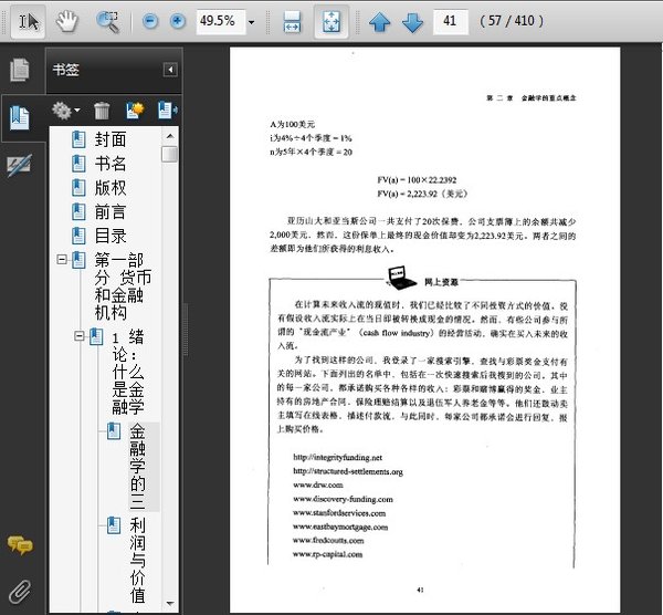 : 第一部分 货币和金融机构 1 绪论:什么是金融学 金融学的三大领域 利润与价值 企业结构的三种类型 企业的规模及其资源 法律和道德问题 理论和应用 2 金融学的重点概念 货币的时间价值 终值 现值 长期投资 偿债基金 年金 年金的现值 年金的终值 风险与回报 补充材料一:退休后,你还能付得起生活费用,安度晚年吗? 3 货币 什么是货币? 货币的特点 货币与文化 欧元 经济实力的象征 套期保值 货币的形式 非货币 货币的未来发展 4 美国联邦储备系统和其他中央银行系统 美国设立联邦储备系统的目的 美国联邦储备系统的结构 美国联邦储备系统的使命 12家联邦储备银行的作用 美国联邦储备系统的实力 美国联邦储备委员会主席的作用 其他国家的中央银行系统 5 金融机构 存款性金融机构 非存款性金融机构 养老基金 金融机构和货币的创造 国际金融机构 道德问题 第二部分 公司财务 6 会计职能概述 管理会计和财务会计 财务报表 财务报表分析 常用财务比率的计算 财务比率的应用 非营利性组织的财务比率 财务账簿上的弄虚作假 试算报表 7 盈亏平衡分析和利润 效率与效果 盈亏平衡分析 盈亏平衡与利润 固定成本的改变 变动成本的改变 需求的重要性 利润 定价决策的制定和产品的生命周期 亏损和破产 8 计划、预测和预算 预测未来的支出和收入 年度支出的计划方法 确定基准资产和负债 预测财务状况的变化 现金收支预算 预算与实际收支的比较 9 营运资金管理:短期资产管理 营运资金的定义 营运资金政策 流动资产管理 现金管理 应收账款管理 信用的成本 分析并管理应收账款 存货管理 经济订购批量 存货周转量 存货计价 流动负债管理 10 资本预算 长期决策的制定 公司未来的投资 折旧的价值 设备的租赁 成本和收益的量化 偿还期 风险和资本预算 净现值 盈利指数 非营利性资产的现值 内部收益率 公司战略对投资决策的影响 11 合并与资产剥离 合并与收购 合并的类型 企业合并的架构变化 企业收购的付款方式 现存公司的收购 资产剥离 杠杆收购 恶意收购 企业价值评估 资产评估 资本化率和企业评估 上市公司的评估 第三部分 投资 12 投资概述 金融中介 投机与投资 储蓄账户 负债及其特点 投资银行 股权及其特点 其他形式的投资与投机 13 债券的种类及其估值 债券的定义 债券的条款和条件 常见债券的种类 市政债券 利率和到期值 垃圾债券 债券的发行 债券的购买 债券折价 债券溢价 收益 14 股权 相关术语释义 优先股 普通股 普通股股东的权利 每股收益 普通股的分类 股票的管理 股票回购和库存股份 股票估价 影响股票价值的其他因素 上市股票 交易所内的股票交易 股票的买空交易 美国证券交易所与地方证券交易所 纳斯达克 股指――衡量股市行情的指标 共同基金 资产净值 附录一 货币的时间价值表 附录二 (美国)修正后的加速成本回收制度(MACRS)采用的折旧时间表 术语表