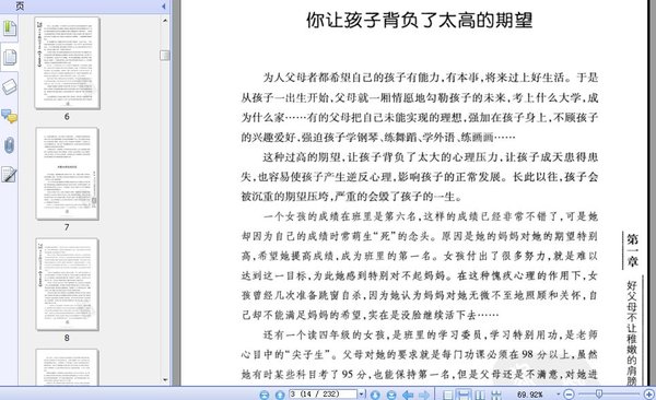 : 第一章 好父母不让稚嫩的肩膀扛得太多 你让孩子背负了太高的期望 拔苗助长只能适得其反 关爱太多反成负担 压力过大严重危害孩子健康成长 勿用成人的标准要求孩子 不要按照自己的意愿设计孩子 如何正确把握对孩子的期望 第二章 好父母不让孩子生活在窒息的环境中 给孩子一点释放天性的时问 让孩子停下来休息一下 不要过分限制孩子的顽皮 让孩子享有充分的自由与开放的意志 让孩子拥有私密的空间 千万不要偷看孩子的日记 放开手来爱 与孩子保持适当距离 让家成为一个"适宜学习的环境" 大自然是最好的老师 尽情和孩子一起疯狂 给孩子一些"纵容" 第三章 你有没有掉进培养"神童"的误区 急功近利的做法会埋下成长隐患 不要盲目加入"制造神童"的行列 把孩子当成普通儿童又何妨 不要迷信孩子努力就能成为天才 接纳孩子比什么都重要 让孩子成为他自己 成长比分数重要 别让家庭教育拖了素质教育的后腿 让孩子学会思考才能造就"神童" 家教兵法:成长需要等待 让孩子向榜样学习 第四章 好父母不用分数衡量孩子的优秀 不要盲目地增加孩子的作业和请家教 不要把"用功学习"挂在嘴上 分数只能说明某一方面的能力 帮孩子消除成绩所造成的压力 父母的付出和孩子的成绩不可能等同 不要为难成绩差的孩子 不要让孩子成为学习的机器 不喜欢读书是因为缺乏兴趣 小心陪读陪出过量的压力 将教育投资控制在可承受的范围 第五章 好父母不强逼孩子样样争第一 不要期望孩子什么都学好 让孩子学钢琴学美术,问过孩子的感受吗 不要把孩子的兴趣"逼"走 尊重孩子的意愿 把选择的权力还给孩子 让孩子做他喜欢做的事情 相信三百六十行,行行出状元 找到孩子身上最具竞争力的特长 只要孩子有一样出色,就有了成功的资本 第六章 好父母让孩子听到鼓励和赞扬 哪怕只有一丁点进步也值得肯定 鼓励孩子勇敢地接受失败 允许孩子犯错误 培养孩子良好的心理承受力 让孩子充满自信地生活 鼓励孩子积极地看待事物 抱怨孩子成绩差,不如多给一点鼓励 孩子身上也有值得父母学习的地方 欣赏孩子的新奇发现 赞扬孩子不要太过分 第七章 好父母不让孩子失去幼小的自尊心 不要否定孩子的未来 给孩子指导而不是批评 不拿自己的孩子与他人比优劣 允许孩子"出格" 辱骂只会让孩子自暴自弃 你只看到了孩子身上的缺点吗 认同孩子的一些"怪想法" 恐吓威胁孩子是愚蠢的做法 要耐心地开导固执的孩子 不要抱怨孩子脑子笨 第八章 你是在把代沟越挖越宽吗 代沟是一堵无形的墙 有代沟不可怕,可怕的是没有沟通 与孩子进行平等的交流 代沟的化解,需要双方的理解 不做唠叨的父母 允许孩子和父母争辩 正确对待孩子在青春期追赶时髦的心理 学会倾听孩子内心的感受 理解孩子的"敏感" 做个会"听话"的父母 第九章 疏通孩子正常的青春期心理 青春期不是"危险期" 孩子早恋与压力过大有关 陪孩子走过身体发育的迷茫期 孩子大了,就会对异性产生好感 不要对孩子的心事妄加揣测 不要强行压制孩子对异性的好感 让孩子学会与异性相处 引导孩子正确处理青春期情感 正确而对孩子的性教育问题 适度是性教育的重要原则 与孩子一起学习青春期知识