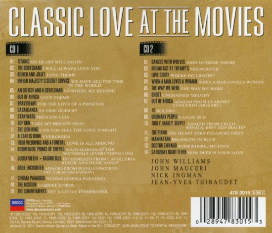 《终极保鑣》、《铁达尼号》、《星际大战》、《教会》、《与狼共舞》、《第凡内早餐》、《爱的故事》、《远离非洲》、《第六感生死恋》、《钢琴师与她的情人》等经典电影中最动人爱情场面的主题曲 Titanic, The Bodyguard, Romeo & Juliet, Dance With Wolves, Love Story, etc.
