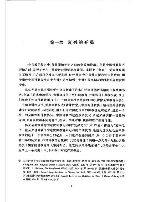 在编辑这套现代中国佛教社会丛书时,所遇问题是它们彼此问会交叉重复多少,每一部是独立成篇、互不干涉,抑或作者应对先前已经论述的再做诠释?正如大家所预料的,笔者采取了折中路线。由于对现代中国佛教社会的理解贯穿于本套书的始终,故所有的探讨都是深契本质的,如果读者想进一步加深理解,不妨查阅笔者的另一部著作《中国佛教的实践》(哈佛大学出版社,1967年版)。虽然后者的序言同样也可以适用于本书,笔者还是要再次指出两点。首先,《中国佛教的复兴》一书将焦点投射于人员、组织和佛教大事上,只有偶尔述及敦义演化和思想史。其次,真理的跋涉之路是没有终点的。如果时间允许,笔者将花费更多的时间(它将是另一个两年或三年)来完善甚至是对那些最基础资料的解释,故在此笔者不再一一做出“还需要更多调查”的说明。还应该指出的是,在第一部书中,大约有三分之一的资料完全来源于访淡,而在这一部中这个比例要稍微小一些。并且这些访谈资料中,绝大部分来自于单独的受访者,而不是对几个受访者访谈资料的整理。