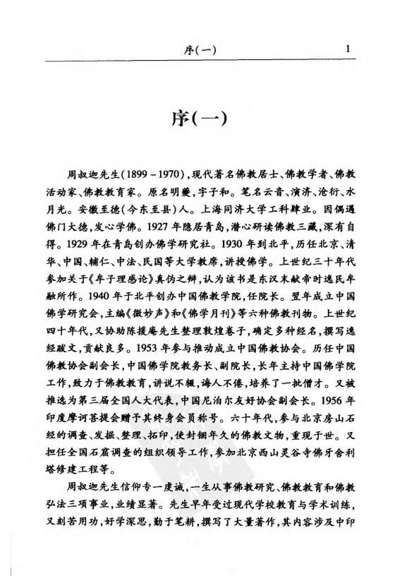 周叔迦先生(1899—1970),现代著名佛教居士、佛教学者、佛教活动家、佛教教育家。原名明夔,字子和。笔名云音、演济、沧衍、水月光。安徽至德(今东至县)人。上海同济大学工科肄业。因偶遇佛门大德,发心学佛。1927年隐居青岛,潜心研读佛教三藏,深有自得。1929年在青岛创办佛学研究社。1930年到北平,历任北京、清华、中国、辅仁、中法、民国等大学教席,讲授佛学。上世纪三十年代参加关于《牟子理感论》真伪之辩,认为该书是东汉末献帝时逸民牟融所作。190年于北平创办中国佛教学院,任院长。翌年成立中国佛学研究会,主编《微妙声》和《佛学月刊》等六种佛教刊物。上世纪四十年代,又协助陈援庵先生整理敦煌卷子,确定多种经名,撰写逸经跋文,贡献良多。1953年参与推动成立中国佛教协会。历任中国佛教协会副会长,中国佛学院教务长、副院长,长年主持中国佛学院工作,致力于佛教教育,讲说不辍,诲人不倦,培养了一批僧才。又被推选为第三届全国人大代表,中国尼泊尔友好协会副会长。1956年印度摩诃菩提会赠予其终身会员称号。六十年代,参与北京房山石经的调查、发掘、整理、拓印,使封锢年久的佛教文物,重现于世。又担任全国石窟调查的组织领导工作,参加北京西山灵谷寺佛牙舍利塔修建工程等。