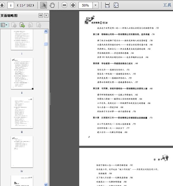 高学历需要修炼职场情商第一课何为职场情商——激烈竞争下的EQ法则人类智慧很“多元”——EQ与职场EQ“不管风吹浪打,胜似闲庭信步”——职业发展有自己的节拍有情商才有更多情感体验——创造彩色的人生“敌人”不是绊脚石,而是踏脚石——成功阶梯靠职场情商攀登EQ、IQ是两回事——情商无法取代没有它你还真不一定能存活——职场生存与发展少不了情商高学历需要修炼职场情商——高学历者不等于高情商第二课走进神秘的职场世界——职场情商里的成功之道为何忧虑的阴云总是散不去——把握当下接受不完美的职场“吾日三省吾身”——想成功先知不足高调的江湖不好混——低调的做人的人走得更长远不受负面情绪的影响——提高自我情绪管理能力远离怨妇——职场不如意十有八九在职场游刃有余——职场情商不高的职场人易受伤我是这个世界的唯一——职场人必须认识到自己的独特价值我是这个世界的唯一——职场人必须认识到自己的独特价值第三课 领略嵘山风雨——职场情商让你完善自我,追求卓越摔了跤才知道脚下有石头——挫折是职场人的宝贵财富让暴风雨来得再猛烈些吧———伤害让你变得百毒不侵风雨嵘山,战胜自己——职业发展是自我完善的过程学会拥抱困难——享受困难的恩赐在第101场风雨后遇见彩虹——追求卓越职业生涯第四课 学会感恩——用感恩助推自己成长信任无价——感谢信任你的人宽容是一种美德——感谢宽容你的人批评的良药——感谢批评你的人羞辱让你拥有自尊——感谢羞辱你的人第五课与同事和老板和谐相处——职场情商让你更有人缘遵守职场情绪规则——克服工作情绪化体察他人情绪——赢得他人信任的职场情商山不过来,我就过去——积极调节和改变自己情绪与人为善——得道多助别把面子不当回事——面子值得珍重第六课从容面对工作——职场情商让你增强职业发展能量让心中充满阳光——乐观心态很重要过好职场每一天——活在当下建立自信——化解自卑情绪保持宁静的心态——化解浮躁情绪你厌倦,迟早也会“被厌倦”——用情商应对高负荷工作保持激情天下谁人不识君——化解焦虑情绪吹散愁云——化解抑郁情绪山外有山——化解自负情绪第七课职场达人并不难当——职场情商让你化解工作压力,高效工作从容面对工作——紧张和松驰可以共舞压力是一种恩赐——善待工作压力压力并非一无是处——变压力为动力向完美主义告别——不要苛求完美放弃是一种情商——学会轻装上阵志存高远——培养和守住心量告别工作狂人——工作与个人、家庭生活相得益彰第八课再见,职场恐惧症——职场情商让你敢于成功天下谁人不识君——不要自我设限恐惧来自于内心——学会相信自己化解恐惧情的阴霾——学会心理暗示职场人不打“哑语”——突破心理障碍成为沟通高手向社交恐惧症告别——广结善缘工作与人际关系平衡——高职场情商有利于建立良好的人际关系小聪明害死人——职场生存做聪明的笨人不再嫉妒——永远超越自我第九课情绪我作主,内心最强大——职场情商让你心智成熟人可以驾驭情绪——做情绪的主人不掌控情绪就被人掌控——你可以掌控情绪上级也有情绪化——理性对待上级工作情绪化不做环境的奴隶——追求内心的强大吸收正能量——用正面语言暗示自己