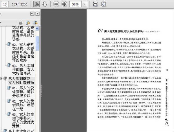 第一篇 恋爱篇――当视觉动物爱上听觉动物 男人用眼睛恋爱女人用耳朵恋爱 01.男人是视觉动物,恋爱时用眼,最易受青春美貌的诱惑 02.女人是听觉动物,恋爱时用耳朵,最挡不住甜言蜜语的攻势 03.男人太相信眼睛,女人太相信耳朵 男人看到群花女人只盯着白杨 01.男人的爱像蛋糕,可以分成很多块 02.女人的爱似风铃,串联在一起 03.女人的爱如飞蛾扑火,男人的爱犹犹豫豫 男人喜欢主动示爱女人喜欢试探索爱 01.基因决定男人更主动 02.聪明的女人在恋爱阶段不应该过分主动,而应该学会掌握主动权 03.试探男人是一件损人不利己的事,也是一件吃力不讨好的活儿 第二章 婚姻篇――婚姻是男人的一个阶段,却是女人的二次生命 男人在婚姻中努力扩张,女人在婚姻中日渐沉沦 01.男人以为婚姻可以让自己从奴隶到将军 02.女人将婚姻视为生命,把婚姻当做一辈子的事业来经营 男人需要崇拜,女人需要疼爱 01.崇拜之于男性,就像赞美之于女性一样不可或缺 02.女人娶来是用来宠的,不是用来懂的 男人爱撒谎,女人爱抱怨 01.与其说男人有一张爱说谎的嘴,不如说女人有一双爱听谎言的耳朵一 02.女人要学会适时开导自己――抱怨不可怕,可怕的是不停地抱怨 男人希望女人保持不变,女人希望自己能够改造男人 01.男人希望女人不变,可女人无法阻挡地变了 02.塑造一个理想中的男人只能是枉费心机 第三章 沟通篇――不同的星球不同的语言 男女“星球大战”:当金星和火星相撞 01.男人+女人=战争 02.金星人火星人为什么会相撞――吵架或许还有很多你并不知道的潜在因素 03.学会“建设性”的吵架 不同星球不同语言:语言使用的差异会使两个关系密切的男女卷入激战 01.思维不同,性情不同,语言的表达方式也自然不同 02.表达情感VS传递信息――男人怎样恰当、准确地翻译女人的话 03.女人要学会的第三种语言 吵架:夫妻相处中的一门艺术 01.夫妻间时有争吵,说明彼此心中还有爱 02.什么样的架不能吵 第四章 相处篇――橡皮筋男人和波浪女人 男人以独立为荣,女人以亲密为悦 01.男人需要独立,女人渴望亲密 02.女人要多给男人一些独立的空间 03.男人只需要在言语和动作上稍有改善,女人就会感受到你的爱意 男人像橡皮筋,女人像波浪 01.女人越想亲近,男人越想抽离 02.男人“逃避”后,才会更亲近 03.女人就像波浪有属于自己的“循环” 04.当逃避男遇到低谷女――女人进入深谷,男人需要做什么 男人躲进洞穴,女人千万别滔滔不绝 01.男人最大的恐惧之一,就是他还不够好 02.不要试图“干涉”洞穴里的男人 03.如何支持“洞穴中的男人” 第五章 事业篇――男人没有事业活不了,女人要事业是为了活得更好 事业是男人立足社会的基础 01.男人一方面把工作看成是他生命的主心骨,另一方面又对他自己的工作日益不满 02.男人把工作当成事业经营,而不是养家糊口的手段 03.职场对比:男人和女人的差异 打造37度男人:要事业心,不要工作狂 01.女人爱上“工作狂”就等于与寂寞相伴 02.是什么让他变成工作狂7 03.“居家型”和“事业型”男人均不缺少真爱 女人影响男人事业的高度 01.好男人的背后,一定有一个“扶助”他的女人 02.当男人陷于事业的低谷,女人需要做什么 工作让女人活得更精彩 01.工作是女人最好的化妆品 02.职业女性,找到自己的工作幸福感 第六章 友谊篇 ――男人的友情是写意,女人的友情是工笔 朋友是男人一生最大的支持 01.男人的友情如写意画,看似随意却稳定 02.女人可以为爱情舍弃友情,但男人会为了友情冷落女人 03.男人身边的朋友是他的一面镜子――没有朋友的男人不能嫁 女人的友情如工笔画,需要仔细呵护 01.女人需要朋友,就像生物需要阳光、空气和水一样 02.女人为何经常会把友谊弄丢 异性友谊――带刺的玫瑰,好看却扎手 01.纯洁的异性友情离我们有多远 02.红颜知己――可远观而不可亵玩焉 03.女人需要有要好的女朋友,但也需要有一个真正坦诚的“男闺蜜” 第七章 时时用心打点,处处求同存异――围城内外的零碎 最难念的一本经叫“婆媳经” 01.婆媳关系是仅次于婚外恋的夫妻感情杀手 02.婆媳关系的改善,重点要看男人的成熟度 做好表面文章,融洽婆媳关系 01.见婆婆前就要做好的心理准备 02.聪明女人与公婆过招,成最受宠媳妇 03.四大危险婆媳关系怎样搞定 一个孩子多出的烦恼 01.聪明女人善于博采众长,换个角度来看养育孩子 02.孩子的教育,到底该谁说了算 03.孩子面前,父母态度要一致