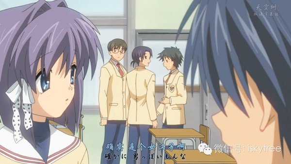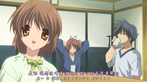 key于2007年发表了CLANNAD要改编为TV版动画的消息,继《Kanon》、《AIR》之后,《CLANNAD》的动画版仍由京都动画负责制作。TV动画版的《CLANNAD》和《Kanon》《AIR》并称为Key社名作三大催泪弹,动画已于2007年10月4日在TBS播出。 CLANNAD的TV版动画第一季共24话,动画声优除男主角冈崎朋也之外(最早的PC版游戏无声优,PS2、PSP、XBOX移植版及2008年2月发行的全语音版有除男主角之外的配音),全部启用游戏原班声优。