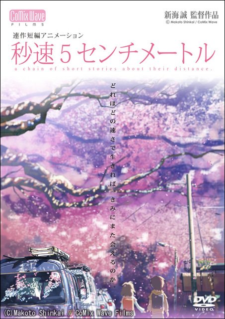 《秒速5厘米》(秒速5センチメートル,副标题:a chain of short stories about their distance)是日本导演新海诚于2007年拍摄的动画电影,由三个短篇组成。本作品是继《云之彼端、约定的地方》之后,新海诚的第四部作品。在这部作品里新海诚表达了不同于之前的作品风格,没有揉入幻想或科幻元素,试图从一个不同的角度来看真实世界。
