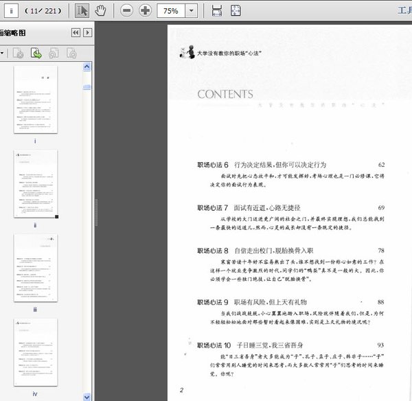 : 职场心法1 课堂学技法,课下炼心法 职场心法2 专本的学历证书,硕博的社交水平 职场心法3 学Web 3.0精髓,打造最in自营销 职场心法4 招聘中的这些秘密不能说,但你要心中有数 职场心法5 和面试官的博弈不是一时,更是心理持久战 职场心法6 行为决定结果,但你可以决定行为 职场心法7 面试有近道,心路无捷径 职场心法8 自信走出校门,脱胎换骨入职 职场心法9 职场有风险,但上天有礼物 职场心法10 子日睡三觉,我三省吾身 职场心法11 今天很残酷,明天更残酷,后天很美好 职场心法12 职场不是沿着规划前行的 职场心法13 选择不唯一,心情有四季 职场心法14 欲速则不达,有些必经之路无法绕过 职场心法15 因为独一无二,所以不可复制 职场心法16 社会是现实的,绝招只有一款 职场心法17 如果抱怨成为习惯,个人要作自我检讨 职场心法18 神奇的不是兴趣,而是你自己 职场心法19 工作狂非榜样,过劳的警报要拉响 职场心法20 你是在工作,更是在学习 职场心法21 黔驴大多技穷,鲤鱼多跳龙门