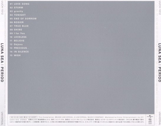 As a final testament to the legendary band, this new best collection album, "PERIOD: The Best Selection", was released right before the band's final performance, just in time for Christmas. The album contains fifteen LUNA SEA hits, with all tracks digitally remastered, and four of the songs re-recorded entirely. The re-recorded songs are mostly their older works. They are tracks 11-13 and 15. The re-recorded songs are "BELIEVE", "Dejavu", "PRECIOUS...", and "WISH". The rest of the songs are remastered, but it's doubtful that you will notice any difference from the original tracks, especially in the newer ones from 1998 and 2000. At any rate, it's good to know that the remastering is there to bring the songs that need it up-to-date.