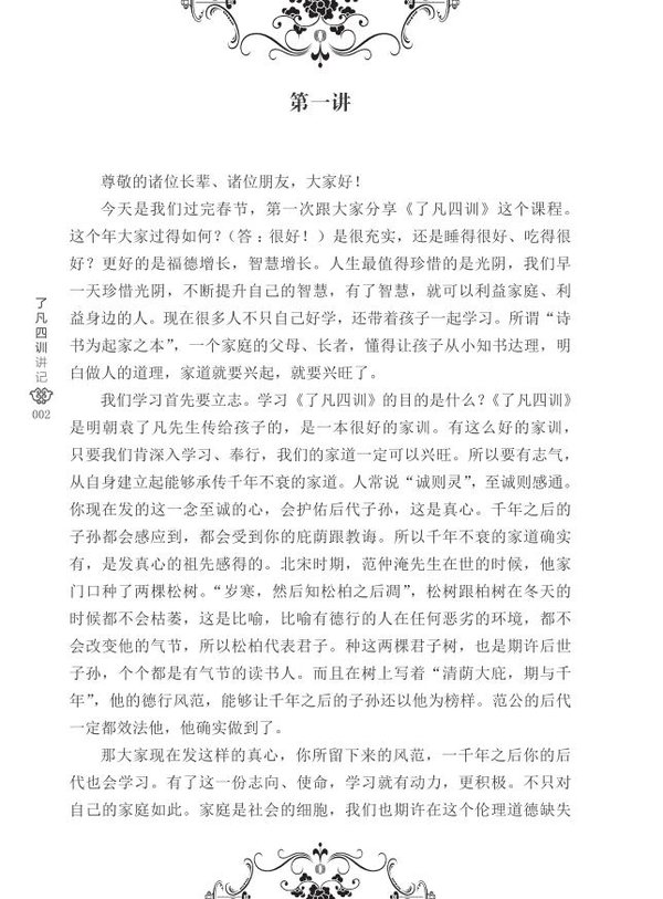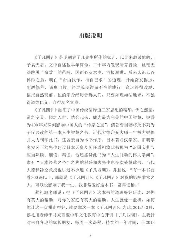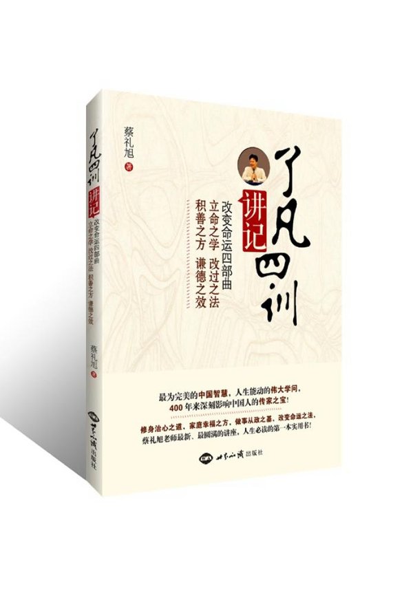 2012年3月,蔡礼旭老师于马来西亚中华文化教育中心开讲《了凡四训》,主要针对来自各地的家长朋友,每周一次课程,持续约一年时间,于2013年1月结束,为蔡礼旭老师迄今为止最新、最圆满的讲座之一。讲座从立命之学、改过之法、积善之方和谦德之效四个方面深入经典,学习、分享了如何改造命运,同时也引导大家了悟生命的真相,契入古圣先贤所体证的至乐境界,并把这种亘古而常新的人生智慧传给我们的儿孙,让他们求子得子、求官得官、求财得财,求什么得什么。本书即由此讲座整理而成,最大程度地保持课程的原汁原味,又给了读者良好的阅读感受。