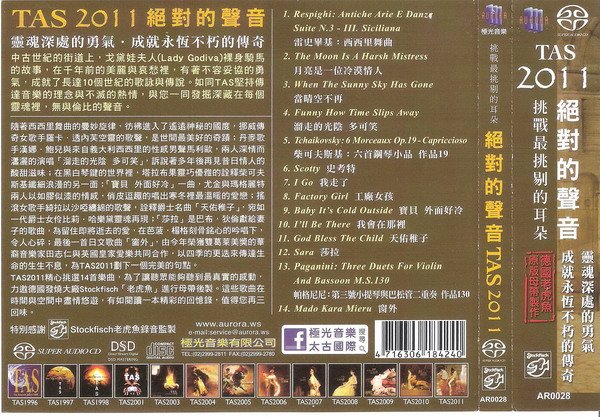 TAS2011精心挑选14首乐曲,为了让听众能够听到最真实的感动,力邀德国发烧大厂Stockfisch“老虎鱼”进行母带后制。这些歌曲在时间与空间中尽情悠游,有如阅读一本精彩的回忆录,值得您再三回味。