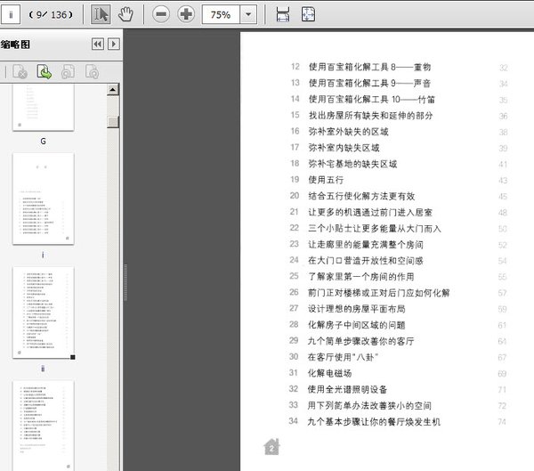 : 小测验:你的家居有多幸福? 1 如何使用和放置“八卦” 2 确定你的风水目标和愿望 3 九个简单步骤清洁你的居室 4 使用风水化解方法所需的准备工作 5 使用百宝箱化解工具1――水晶 6 使用百宝箱化解工具2――镜子 7 使用百宝箱化解工具3――灯饰 8 使用百宝箱化解工具4――植物和鲜花 9 使用百宝箱化解工具5――水饰 10 使用百宝箱化解工具6――色彩 11 使用百宝箱化解工具7――吊饰 12 使用百宝箱化解工具8――重物 13 使用百宝箱化解工具9――声音 14 使用百宝箱化解工具10――竹笛 15 找出房屋所有缺失和延伸的部分 16 弥补室外缺失的区域 17 弥补室内缺失区域 18 弥补宅基地的缺失区域 19 使用五行 20 结合五行使化解方法更有效 21 让更多的机遇通过前门进入居室 22 三个小贴士让更多能量从大门而入 23 让走廊里的能量充满整个房间 24 在大门口营造开放性和空间感 25 了解家里第一个房间的作用 26 前门正对楼梯或正对后门应如何化解 27 设计理想的房屋平面布局 28 化解房子中间区域的问题 20 九个简单步骤改善你的客厅 30 在客厅使用“八卦” 31 化解电磁场 32 使用全光谱照明设备 33 用下列简单办法改善狭小的空间 34 九个基本步骤让你的餐厅焕发生机 35 将大型家具放置在主导位置 36 增强孩子卧室里的能量 37 让你的家庭办公室更 38 化解浴室问题以拥有更多健康和财富 39 浴室位置不当的化解方法 40 调整炉灶以获得健康和财富 41 打造健康的厨房 42 寻找理想的住所 43 主卧室须是安静的地方 44 选择床的位置 45 10个基本原则让你享受良好睡眠和性生活 46 卧室中七个变化助你吸引新的伴侣 47 化解卧室的问题 48 化解天花板倾斜问题 49 化解居室的横梁问题 50 用镜子对付难缠的邻居 那么,你的家居到底有多幸福呢? 推荐阅读书目 致谢