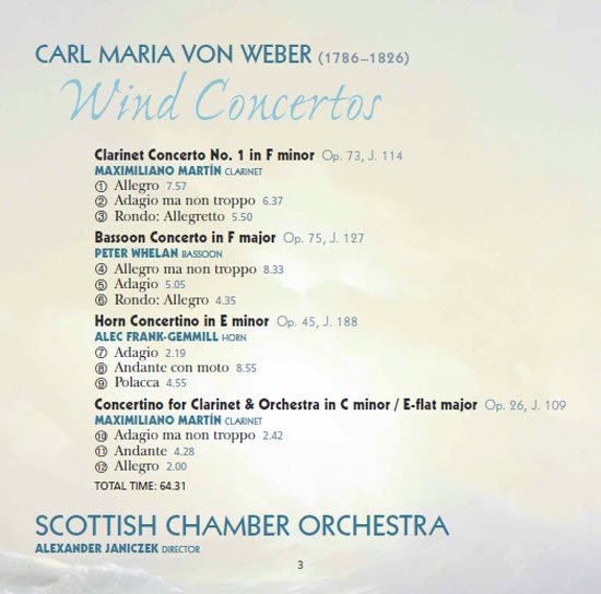 The Scottish Chamber Orchestra section principals, Maximilano Martín (clarinet), Peter Whelan (bassoon) and Alec Frank-Gemmill (horn), dazzle in Weber's virtuosic and thrilling concertos.