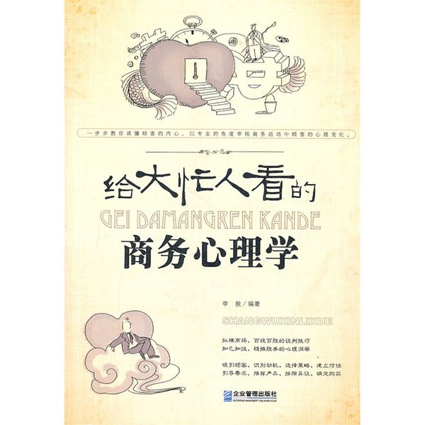 由李貌编著的《给大忙人看的商务心理学》为您解读顾客的身体语言和心理密码,从而使您把握顾客心理,引导购买。通过介绍销售中多种心理定律以及这些心理定律如何发挥效用,在分析问题的同时,向您展示商务心理学对各种商务活动中实际问题的具体解决方法及操作要领,具有很强的实用性。