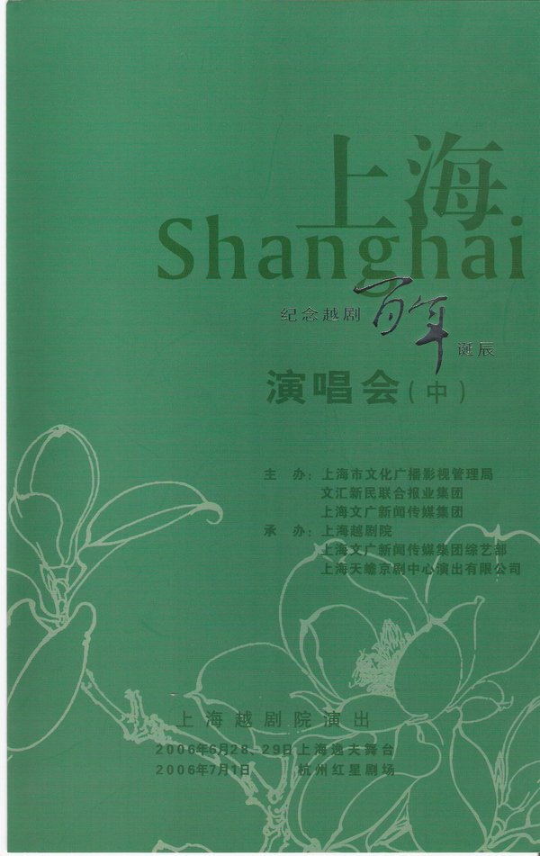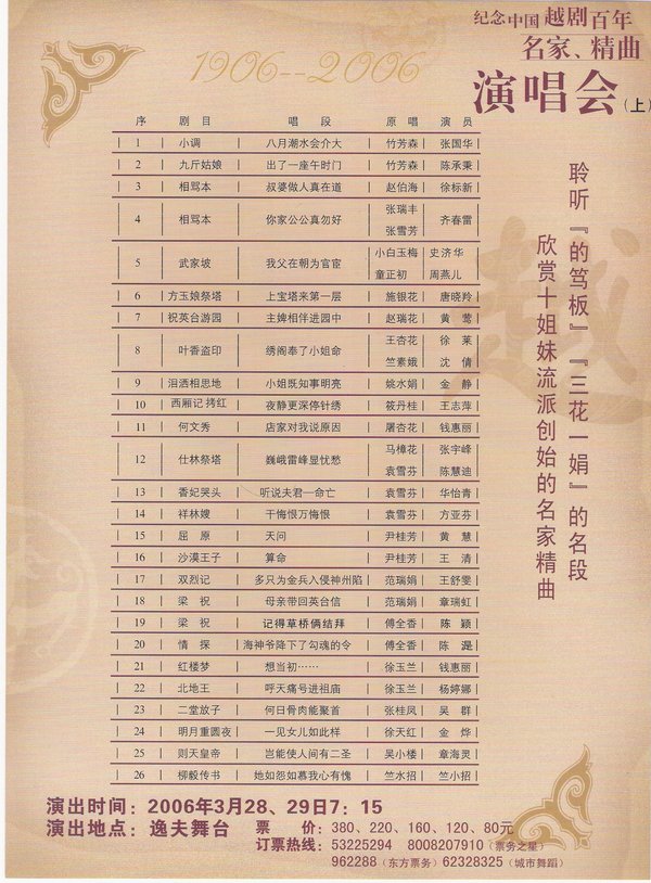 纪念中国越剧诞生 100 周年———“百年越剧名家名曲演唱会”分为上、中、下三部分,分别在 2006 年 3 月、5 月和 7 月上演于逸夫舞台。第一部主要呈现给观众越剧早期的一些唱腔和唱段,包括南调腔中板、北调腔中板等越剧的起源唱腔,展现越剧发展的历程。第二部分就是“三花一娟”、“十姐妹”,一直到上世纪 60 年代男女合演等,综述越剧的发展过程。第三部分则由当代青年艺术家和越剧后继接班人,从当今的角度来呈现越剧的希望、前途与光明。