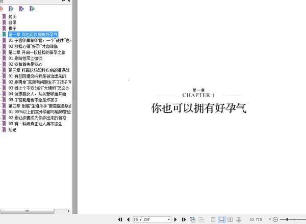: 目录 楔子 第一章 妳可以拥有好孕气 01 子宫卵管输卵管,一个“硬件”也不能少 02 放松心情“好孕”才会降临 第二章 开启一段轻松的备孕之旅 01 别给性带上枷锁 02安胎首先是安心 第三章 打赢这场妇科疾病的遭遇战 01 有些阴道炎纯粹是被治出来的 02 别再拿“宫颈有问题升不了孩子”吓唬人 03 摊上个不安分的“大姨妈”怎么办 04 做漂亮女人,从关爱卵巢开始 05 子宫肌瘤也不全是坏孩子 第四章 制服“生殖杀手”更需医患联合 01 95%以上的宫外孕都与输卵管炎症有关 02 别让多囊成为你多出来的包袱 03 有一种病真正让人痛不欲生 后记 .