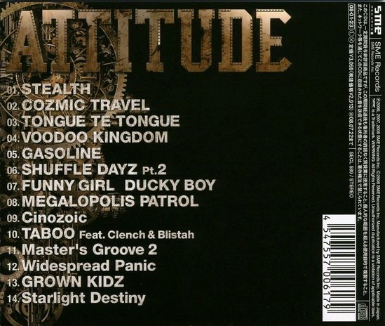 2008年的一开始SOUL’d OUT灵魂出窍就推出这张自2006年发行的专辑「ALIVE」以来睽违2年的第四张全新专辑「ATTITUDE 态度」,终极收录SOUL'd OUT灵魂出窍本身在单曲榜最高纪录单曲「Strlight Destiny」起,「GROWN KIDZ」到连发单曲「VOODOO KINGDOM」、「MEGALOPOLIS PATROL」、「COZMIC TRAVEL」等,共6首畅销单曲在内共14首的全新专辑『态度ATTITUDE』,是让歌迷的完整回顾2007年SOUL'd OUT灵魂出窍的活动的轨迹。