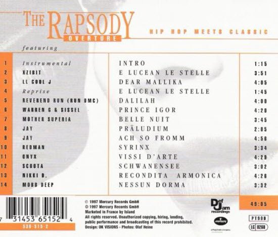 该RAPSODY序曲:嘻哈会见经典混音是由嘻哈和古典的,它结合美国的说唱与欧洲歌剧演唱家的概念专辑。它被发布於1997年由Mercury唱片公司和Def Jam唱片录制发行。