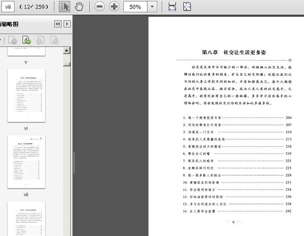 第一章 用简单开启幸福人生 1.简简单单,收获幸福 2.简单的才是自然的 3.最美的一定简单 4.让心灵单纯一些 5.勿做金钱的奴隶 6.给贪欲上把锁 7.阴谋害人终害已 8.除去心中的杂草 9.人生路上要学会取舍 10.心病终须心药医 11.听从心灵的召唤第二章 机遇敲响幸福之门 1.机不可失,失不再来 2.打好人生这副牌 3.你为什么抓不到机遇 4.要学会适时展露自己 5.学会倾听,捕捉机遇 6.发挥自己的优势 7.机遇垂青积极行动者 8.机会属于有恒心者 9.脚踏实地才能看到机遇 10.要学会审时度势 11.抓住机会就能反败为胜 12.机遇和奋斗同等重要 13.不放弃,机遇终将到来第三章 选择是一门学问 1.选择是一种力量 2.命运掌握在自己手中 3.活在当下,把握今天 4.顺应大势做出选择 5.放下无谓的固执 6.学会做单项选择 7.兴趣的选择很重要 8.改变不了的就去适应 9.放弃有时是明智的选择 10.完美只是一种理想的境界 11.勇于超越自己第四章 有付出才会有收获 1.付出也是一种幸福 2.懂得付出的人最富有 3.爱比被爱更幸福 4.给别人一个温暖的拥抱 5.请伸出你的援助之手 6.用心感受付出的快乐 7.付出是一种生活态度 8.用心耕耘才会有收获 9.多一点努力和付出 10.付出同样是美丽的 11.付出成就杰出第五章 心理健康是幸福之基 1.莫让心灵蒙尘 2.不要等待别人来解决你的痛苦 3.走出忧虑的沼泽 4.让生活远离焦虑 5.恐惧是心灵最大的敌人 6.“出丑”是成功的必经之路 7.控制你的愤怒 8.用勇气打败懦弱 9.学会遗忘才能走出阴影 10.骄傲之心不可有 11.控制“不满意心理” 12.与坏习惯说再见 13.学会调整心情,保持心理健康第六章 理财为幸福添助力 1.保持一颗节俭之心 2.从身边的小事做起 3.一定要有理财观念 4.改变消费习惯 5.合理安排好家庭消费 6.理财规划五步走 7.会花钱才会赚钱 8.科学投资的三把钥匙 9.居安思危,树立风险意识 10.把鸡蛋放在不同篮子里 11.保持一颗平常心第七章 经营好你的婚姻 1.幸福婚姻需要“保鲜” 2.夫妻双方要学会沟通 3.男人也是听觉动物 4.在家就做个小女人 5.婚姻不是改造所 6.不要做一个“唠叨婆” 7.婚姻需要自由的空间 8.男人也有自己的财政权 9.学会给对方面子 10.走出婚姻的低谷期 11.婚姻中要学会宽容第八章 社交让生活更多姿 1.做一个感情投资专家 2.用你的赞美打开局面 3.沟通是一门艺术 4.指责别人是愚蠢的表现 5.委婉指出对方的错误 6.管住自己的嘴 7.顾及别人的感受 8.含糊其辞巧利用 9.想一想多数人的做法 10.掌握朋友间的距离 11.学会聪明的暗示 12.你的涵养要时时保持 13.多与志同道合的人交往 14.女人要学会装