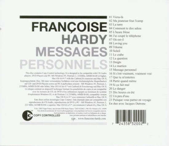 这首《Message personnel》特别的地方是整首曲子的前半段都是用口白的方式,到进入副歌才用演唱的。这首由Françoise Hardy填词,Michel Berger谱曲的曲子也成了Françoise Hardy的代表作之一。