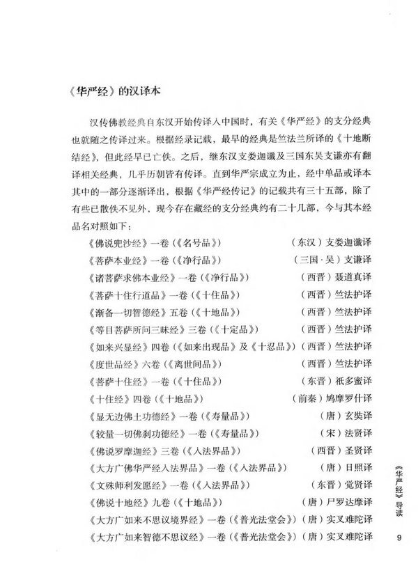 此经第三译四十卷本,它的梵文原本一万六千七百偈(见《贞元释教录》卷十七)系南天竺乌荼国王亲手书写遣使于贞元十一年(795)十一月送赠来唐。翌年六月,唐德宗嘱罽宾三藏般若在长安崇福寺从事翻译,广济译语,圆照笔受,智柔、智通回缀,道弘、鉴灵润文,道章、大通证义,澄观、灵邃等详定,至十四年(798)二月译毕,成四十卷。其内容系勘同旧新两译《华严经》的《入法界品》一品,但文字上大为增广;尤其是四十卷有普贤十大行愿,和新添的普贤广大愿王清净偈,是前此两译《华严经》中所未有。以上是汉译此经的三大译本。此外,此经中某一品或一部分传译于中国的为数也不少。公元二世纪中--后汉支娄迦谶曾于洛阳译出《兜沙经》一卷,当是此经别行本汉译的开始,吴支谦、西晋竺法护、聂道真乃至南北朝、隋、唐各朝,都有《华严经》的支分别行本译出,在法藏《华严经传记》卷一中曾列举有这类别行译本三十五部。今略就现存各本并对照唐译各品会列载如下:
