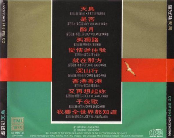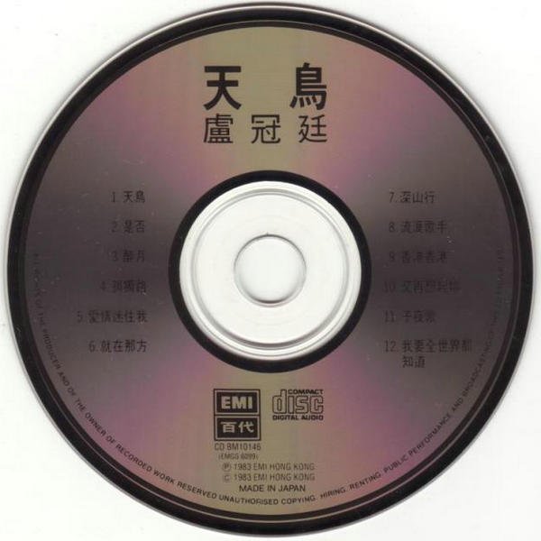 本专辑出版于1983年﹐是黑胶时代的专辑﹐同期有卡带同时上市﹐数年后有CD出版﹐本张就属于首次出现的CD版本,以我的经验判断是在1988年或1989年发行的,日本东芝制作。《天鸟》于2004年以“卢冠廷真存版 4 in 1”Boxset形式再版,另外三张专辑是《小镇》、《过路人》和《陪着你走》。 在2013年,EMI并到环球前,发行了一套卢冠廷的“珍藏套装”,9张专辑+1张演唱会专辑共10张专辑。这套我是有的,不过还是发布早期的版本比较好。