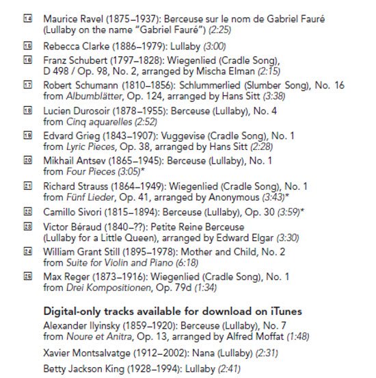 Singing or playing music to a child to make him/her sleepy is as old as humanity, but the lullaby in classical instrumental music is of more temporally circumscribed vintage. The earliest piece on this album of lullabies for violin and piano is probably the Wiegenlied, D. 498, of Franz Schubert; the latest are perhaps Mother and Child, for violin and piano, by William Grant Still, and George Gershwin's Summertime, which is delightful heard in this context. In between, however, the form was extraordinarily popular, and violin and piano were a favored combination; Summertime and several other pieces here are arrangements, but the majority were originally composed for this medium. Violinist Rachel Barton Pine indicates that the birth of her first child inspired her to issue the album, and identifies new mothers as a possible marketplace, but the collection also ought to be heard by those interested in the domestic significance of the smaller Romantic genres. There are some lovely works here that aren't much heard except as encores, such as Grieg's Vuggevise (Cradle Song, track 19), and others by composers now all but unknown. Twenty-five lullabies in a row is a lot, but Pine has taken steps to keep you from nodding off: she classifies the pieces as "warm," "delicate," or "mysterious," and uses a different mute for each. The temptation to give this as a baby shower gift is strong, but that's not its only use.