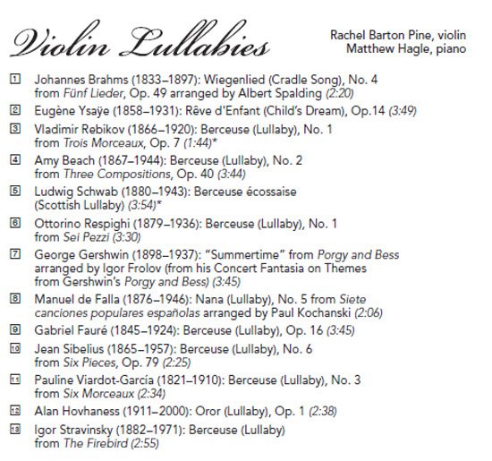 The world's first lullabies were simple songs sung or hummed by parents cradling their infants and rocking them to sleep. After the birth of violinist Rachel Barton Pine's first child in 2011 she could find no existing collection of classical violin lullaby scores or recordings, so she set about gathering sheet music from libraries around the world and recording her own versions with pianist Matthew Hagle. Familiar tunes and new discoveries intertwine in this sweet, timely release celebrating the beauty of new life and parenthood.