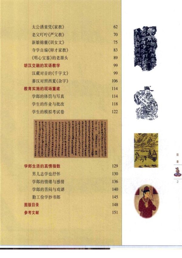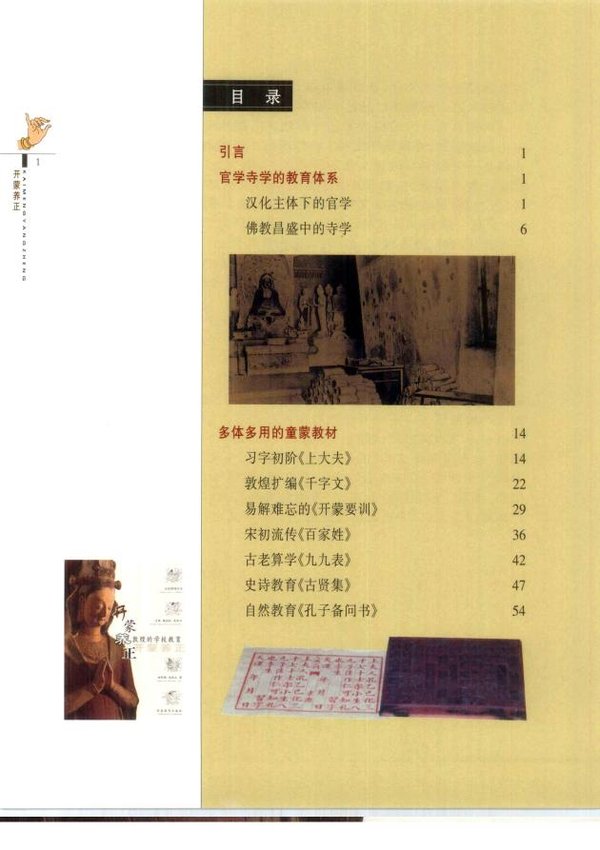 走进藏经洞,宛如走入博物馆,生活片段一幕幕重新上演;走进石窟,则仿若进入美术馆,划时代的纪录一幅幅再现眼前。壁画中的州、县学堂的布局,学郎雁行有序的情景与助教体罚学生的影像,依稀可见。藏经洞中《千字文》、《开蒙要训》、《太公家教》、《辩才家教》等童蒙教材,历历在目;孩子们习字的《上大人》、学生日课与老师批改的《千字文》作业,依旧是朱墨烂然;风行至今的九九乘法,也赫然在焉。学郎们抄写在卷末、书背那一首首涂鸦似的诗歌,正向我们倾诉着勤奋志学、勤工俭学、向往爱情,苦闷而稚嫩的心情。