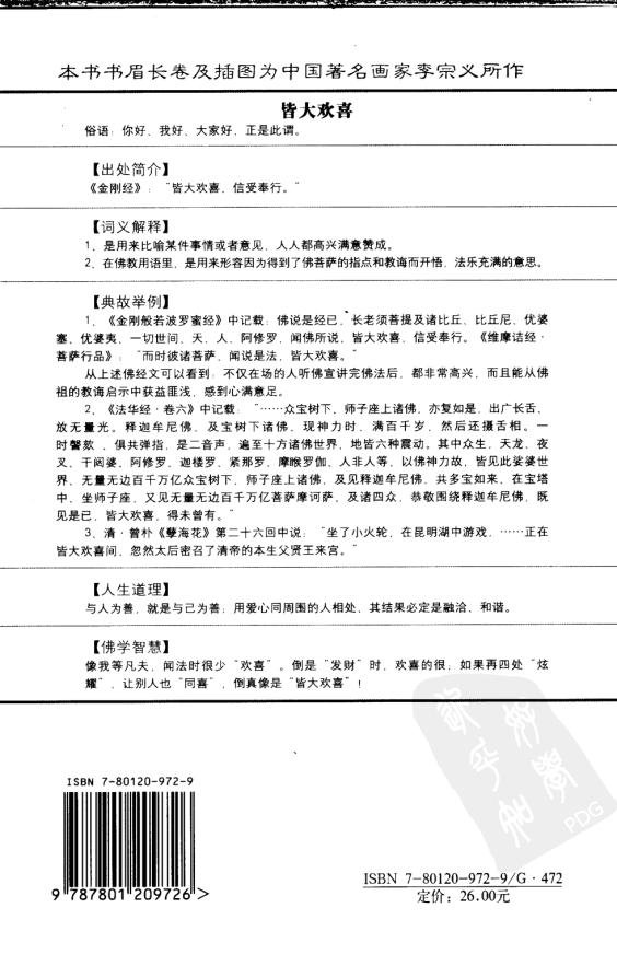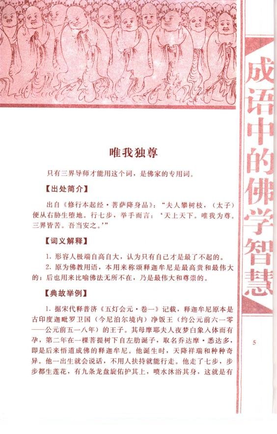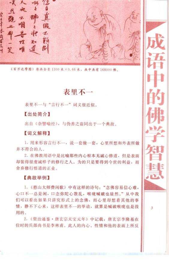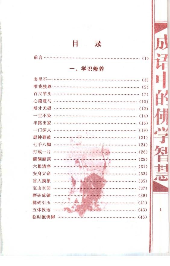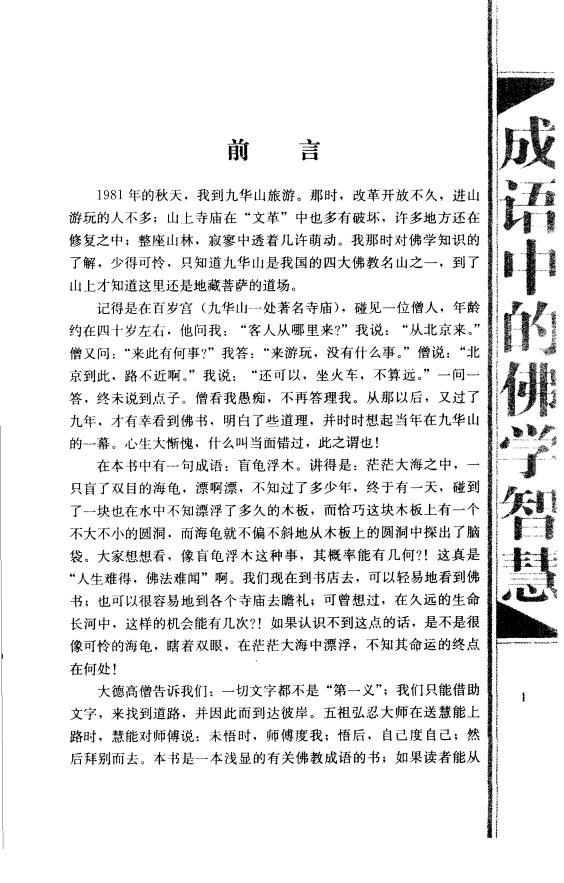 本书中有一句成语:盲龟浮木。讲的是:茫茫大海之中,一只盲了双目的海龟,漂啊漂,不知过了多年,终于有一天,碰到了一块也在水中不知漂浮了多久的木板,而恰巧这块木板上有一个不大不小的圆洞,而海龟就不偏不斜地从木板上圆洞中探出了脑袋,大家想想看,像盲龟浮木这种事,其概率能有几何?!这零点是“人生难得,佛法难闻”啊。我们现在到书店去,可以轻易地看到佛书;也可以很容易地到各个寺庙去瞻礼;可曾想过,在久远的生命长河中,这样的机会能有几次?!如果认识不到这点的话,是不是很像可怜的海龟,瞎着双眼,在茫茫的大海中漂浮,不知其命运的终点在何处! 本书是一本浅显的有关佛教成语的书,如果读者能从中悟出些人生的道理,并因此能此起对佛学知识的渴求,即大大超过了撰写本书的目的。