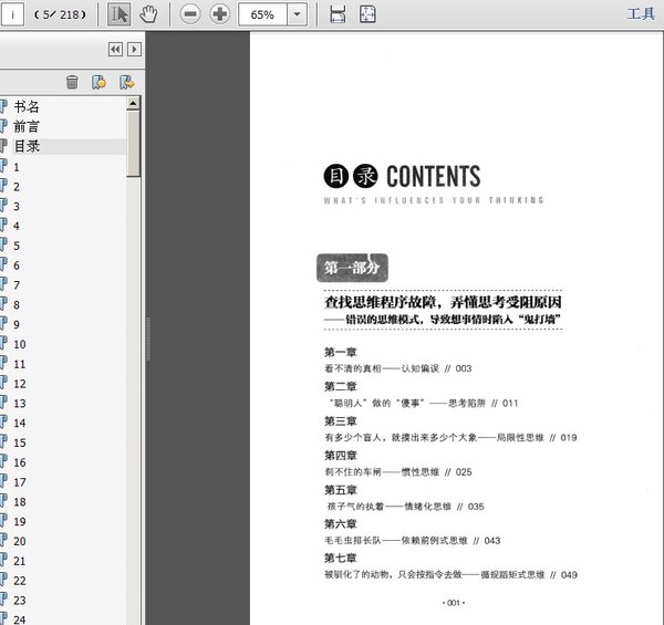 第一部分 查找思维程序故障,弄懂思考受阻原因 ——错误的思维模式,导致想事情时陷入“鬼打墙” 第一章 看不清的真相——认知偏误 第二章 “聪明人”做的“傻事”——思考陷阱 第三章 有多少个盲人,就摸出来多少个大象——局限性思维 第四章 刹不住的车闸——惯性思维 第五章 孩子气的执着——情绪化思维 第六章 毛毛虫排长队——依赖前例式思维 第七章 被驯化了的动物,只会按指令去做——循规蹈矩式思维 第八章 “是谁动了我的奶酪?”——恐惧变化式思维 第九章 困在生活的“格子间”里——缺乏未来式思维 思维模式测试第二部分 了解大脑,植入思维新程序 ——驱动深层思维,让大脑变得灵活起来 第一章 打开你的私人库房——开发思维潜能 第二章 双手较劲,比一只手更有力——开发右脑思维资源 第三章 画好你的“心灵地图”——改善心智模式 第四章 落水后,你的第一反应是什么——改善潜意识层思维模式 第五章 “大块头”的大智慧——思维训练法 第六章 给思维染上“颜色”——六顶思考帽 第七章 让你的全身动起来——调动感官的想象力 第八章 打破禁锢我们的“盒子”——改变旧的思维习惯 第九章 “魔术方块”怎么玩——多元化思维 思维潜能测试第三部分 解读思维策略,进行正确思考 ——新思维方法的运用,让你的一切发生惊天逆转 第一章 “苹果落地”砸出的创新意念——创新思维 第二章 “倒行逆施”的运动——逆向思维 第三章 我们的“视界”无限大——形象思维 第四章 破解事物的“密码”——逻辑思维 第五章 “人不能两次踏进同一条河流”——辩证思维 第六章 “真的还是假的?”——批判性思维 第七章 从四周向“轴心”靠拢——收敛思维 第八章 从“轴心”向四周发散——发散思维 第九章 很多时候,体系比技术更为重要——系统思维 第十章 山道弯弯,轻车熟路才好走——学会正确思考 非常思维测试