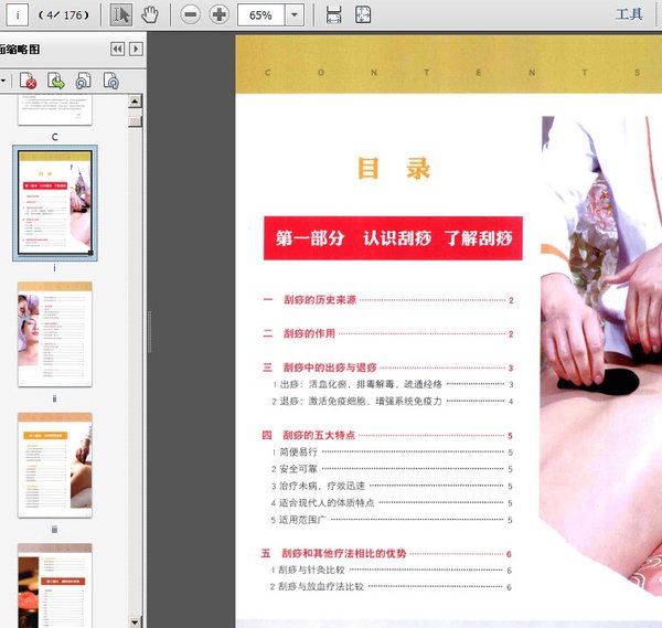 第一部分 认识刮痧 了解刮痧 一 刮痧的历史来源 二 刮痧的作用 三 刮痧中的出痧与退痧 1 出痧:活血化瘀,排毒解毒,疏通经络 2 退痧:激活免疫细胞,增强系统免疫力 四 刮痧的五大特点 1 简便易行 2 安全可靠 3 治疗未病,疗效迅速 4 适合现代人的体质特点 5 适用范围广 五 刮痧和其他疗法相比的优势 1 刮痧与针灸比较 2 刮痧与放血疗法比较 3 刮痧与按摩比较 4 刮痧与拔罐比较 六 刮痧用具 1 刮痧板 2 刮痧油和美容刮痧乳 3 毛巾或清洁的纸巾 4 刮痧板的清洗和保存 七 刮痧的注意事项 1 刮痧时应避风和注意保暖 2 每次只治疗一种病症 3 不可片面追求出痧 4 刮痧后要喝一杯热水 5 身体各部位刮痧注意事项 八 刮痧治疗方法 1 刮痧的刮拭动作要领 2 刮痧操作方法 3 刮痧步骤 4 刮痧补泻手法 5 刮痧握板方法 6 刮痧运板方法 7 刮痧后的反应 九 刮痧的适应证与.禁忌证 1 刮痧的适应证 2 刮痧的.禁忌证 第二部分 日常刮痧保健 一 脏腑保健刮痧 1 心脏和小肠的刮痧保健 2 肺和大肠的刮痧保健 3 肝和胆的刮痧保健 4 脾和胃的刮痧保健 5 肾和膀胱的刮痧保健 二 五体保健刮痧 1 皮肤保健刮痧 2 肌肉保健刮痧 3 血脉保健刮痧 4 筋保健刮痧 5 骨骼保健刮痧 三 体质保健刮痧 1 气虚体质保健刮痧 2 阳虚体质保健刮痧 3 阴虚体质保健刮痧 4 阳盛体质保健刮痧 5 气郁体质保健刮痧 6 血瘀体质保健刮痧 7 痰湿体质保健刮痧 四 四季保健刮痧 1 春季保健刮痧 2 夏季保健刮痧 3 秋季保健刮痧 4 冬季保健刮痧 第三部分 刮痧治疗疾病 一 内科疾病 1 头痛 2 牙痛 3 失眠 4 眩晕 5 咳嗽 6 呃逆 7 哮喘 8 中暑 9 感冒 10 鼻窦炎 11 胃炎 12 胆囊炎 13 胃痉挛 14 腹泻 15 腹胀 16 便秘 17 泌尿系统感染 18 高血压 19 高脂血症 20 糖尿病 21 心悸 22 面神经麻痹 23 中风后遗症 二 外科疾病 1 落枕 2 颈椎病 3 肩周炎 4 腰痛 5 膝关节痛 6 足跟痛 7 痔疮 三 妇科疾病 1 月经不调 2 痛经 3 闭经 4 盆腔炎 5 乳腺增生 6 围绝经期综合征 四 儿科疾病 1 小儿腹泻 2 小儿遗尿 3 小儿腹痛 第四部分 刮痧调理亚健康 1 快速缓解大脑疲劳 2 改善睡眠 3 缓解眼疲劳 4 心慌气短 5 焦虑烦躁 6 颈肩酸痛、僵硬 7 腰酸背痛 8 下肢酸痛 9 手足冰冷 附录一:人体穴位大全 附录二:穴位名称 附录三:十四经