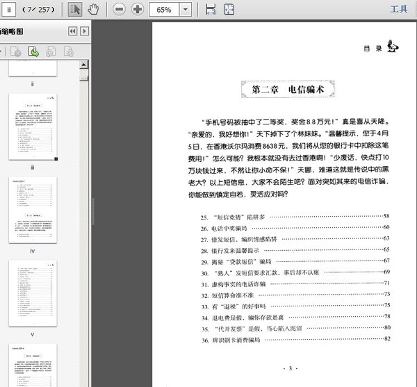 第一章 街头骗术 1.为啥永远猜不中 2.易拉罐中奖了 3.免费抽奖有这般好事 4.便宜的手机你买不买 5.是谁在骗取人们的同情心 6.遭遇碰瓷 7.“洗钱”骗术大揭密 8.“捡钱分钱”老把戏又上街头 9.街边兜售物品莫要买 10.破解象棋残局 11.好心带路当心受骗 12.骗子喊捉贼 13.“白纸变钱”有多神奇 14.藏在IC卡电话里的阴谋 15.火车站接人的骗局 16.神不知鬼不觉的施迷术 17.谁在冒充领导 18.“重金借种”专骗鬼迷心窍之人 19.ATM机的“故障” 20.遭人恨的医托 21.“义诊”原来是骗局 22.不为人知的电子秤 23.商品清仓是假骗人是真 24.揭开“外贸服装”内幕 第二章 电信骗术 25.“短信竞猜”陷阱多 26.一条中奖短信 27.错发短信编织情感陷阱 28.银行发来温馨提示 29.揭密“贷款短信”骗局 30.“熟人”发短信要求汇款事后却不认账 31.吓人的虚假短信 32.短信算命准不准 33.有“退税”的好事吗 34.退电费是假骗你存款是真 35.“代开发票”是假当心陷入泥沼 36.辨识刷卡消费骗局 37.“优惠”电话卡是真是假 38.电话敲诈骗局 39.“一声响”电话骗你没商量 40.猜猜我是谁 41.你家电话“欠费”了 42.谨防以“电话车险”为名诈骗 43.“法院传票”骗局来了 44.电视购物骗局多 45.真假快递员 46.包裹诈骗藏猫腻 47.周年店庆中奖的骗局 第三章 商业骗术 48.保健品令老人很受伤 49.非法传销的骗人伎俩 50.“免费上门服务”是陷阱还是馅饼 51.旅游必备的防骗常识 52.纪念币陷阱多不懂行易被坑 53.保险真的不保险 54.车险理赔“连环套” 55.购买二手车防骗有绝招 56.汽车维修名堂多 57.揭露房屋中介黑幕 58.防陷阱放心购到好房 59.破解装修陷阱的小窍门 60.商标代理骗局防不胜防 61.专利的诈骗手法 62.识别招商骗局 63.连锁加盟要当心 64.外贸淘金多坎坷 65.皮包公司空手套白狼 66.号称融资实为骗资 67.民间借贷之重重陷阱 68.炒股公司赚钱的黑幕 69.当心原始股骗局 70.以“境外上市”为名的非法发行股票的骗术 71.用支票存取时间差也能进行诈骗 72.信用卡非法套现揭秘 73.直面合同诈骗 第四章 网络骗术 74.揭秘QQ视频骗钱的真相 75.盘点网游骗术 76.婚恋网:骗钱骗感情 77.网上买票几多愁 78.网购遇骗怎么办 79.是谁在冒充客服人员 80.防范网络钓鱼的技巧 81.网上认证是圈套 82.网上代办公司骗人钱财 83.网上银行大盗 84.网络赌博让你输得血本无归 85.揭开网络传销的神秘面纱 86.警惕网上投资骗局 第五章 上学、求职陷阱 87.以介绍工作为名进行诈骗 88.网络虚假招聘骗局 89.揭秘试用期骗局 90.做兼职谨防被骗 91.小广告高薪背后的秘密 92.面试骗局 93.女生求职当心遇色狼 94.“储备干部”骗局揭秘 95.求职慎签“陷阱”合同 96.“黑职介”行骗招数 97.星探公司行骗招数 98.出国务工如何防骗 99.看清招生陷阱防范高招诈骗 100.慧眼识别留学骗局