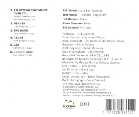 Other than an album for the Italian Red label the previous March, this CD from the defunct Black-Hawk label was the first to feature trumpeter Tom Harrell with the Phil Woods Quintet. At this point in time, bassist Steve Gilmore and drummer Bill Goodwin had been with the band since its beginning 12 years before, while pianist Hal Galper was a five-year veteran. The repertoire on the set is quite strong, with a pair of less-played Duke Ellington pieces (the beautiful "Heaven" and "Azure") being performed along with Dave Brubeck's "The Duke," Sam Rivers' "222," the standard "I'm Getting Sentimental Over You" and Harrell's "Occurrence." Phil Woods sounds quite inspired throughout the date by Harrell's presence, giving him another horn to work off of. Recommended. ~ Scott Yanow Recorded in 1984. Personnel: Phil Woods (clarinet, alto saxophone); Tom Harrell (trumpet, flugelhorn); Hal Galper (piano); Bill Goodwin (drums). Liner Note Author: George Kanzler. Recording information: Bearsville Sound Studios, Bearsville, NY (12/28/1984/12/29/1984). Photographer: Veryl Oakland. Unknown Contributor Role: Herb Wong. Personnel: Phil Woods (alto saxophone, clarinet); Tom Harrell (trumpet); Hal Galper (piano); Steve Gilmore (bass); Bill Goodwin (drums). JazzTimes (10/96, p.101) - "...certainly one of the finest [quintets] in the era of what we call modern jazz, and this particular recording shows off the group at its imaginative and adventuresome best....This is a fine piece of work that is highly recommended."