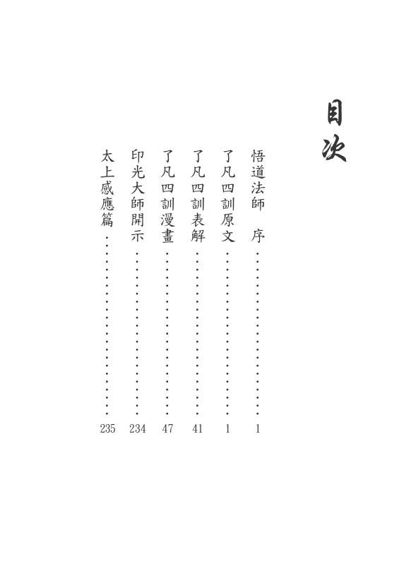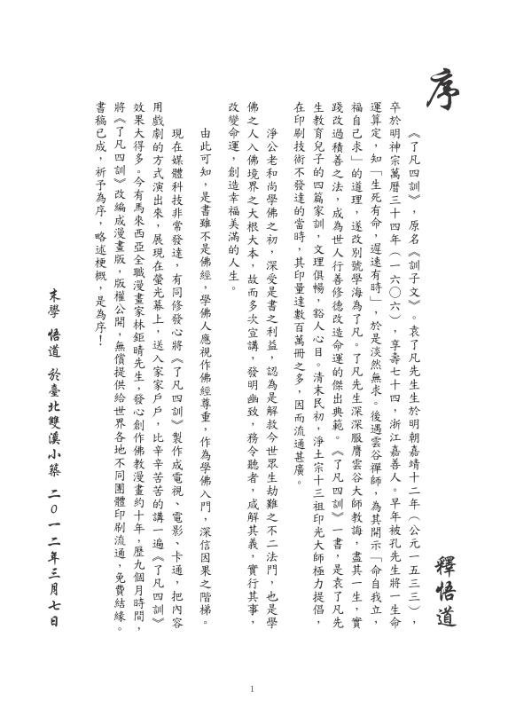 由此可知,是书虽不是佛经,学佛人应视作佛经尊重,作为学佛入门,深信因果之阶梯。 现在媒体科技非常发达,有同修发心将《了凡四训》制作成电视、电影、卡通,把内容用戏剧的方式演出来,展现在荧光幕上,送入家家户户,比辛辛苦苦的讲一遍《了凡四训》 效果大得多。今有马来西亚全职漫画家林巨晴先生,发心创作佛教漫画约十年,历九个月时间, 将《了凡四训》改编成漫画版,版权公开,无偿提供给世界各地不同团体印刷流通,免费结缘。 书稿已成,祈予为序,略述梗概,是为序!
