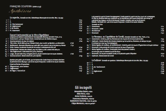 Reviews: The ensemble Gli incogniti, led by Amandine Beyer, makes their harmonia mundi début with this album of chamber music by François Couperin. When he published his two Apothéoses in memory of two great masters of music in 1724-25, François Couperin was asserting his desire to promote a meeting of the French and Italian styles – from a very Gallic point of view, naturally.