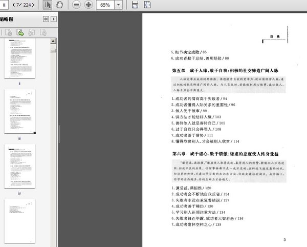 : 第一章成于梦想,败于浑噩:远大的目标开启成功之门1.心中要有明确的目标2.起跑领先一小步,人生领先一大步3.认清自我,将无往不利4.成功者善于激发自我5.脚踏实地而非想入非非6.明确目标立即行动第二章成于乐观,败于消极:良好的心态奠定成功的根基1.成功者的心中充满阳光2.失败者总是在找借口抱怨3.成功者善于用行动寻找问题的突破口4.成功者善于管理自己的情绪5.在困难面前保持良好的生活态度6.失败是走向成功的动力第三章成于自律,败于放纵:严格的要求成就完美人生1.成功者勤奋,失败者懒散2.成功者对自己负责,失败者要别人负责3.成功者恪守诚信,失败者言而无信4.成功者善用时间,失败者浪费光阴5.提高品德修养,提升成功机率6.不要让欲望毁了自己7.想成功还需要“本钱”第四章成于细节,败于浮躁:专注的精神铸就成功品质1.成功者都是敬业者2.急功近利只会与成功背道而驰3.成功者只专注于自己熟悉的领域4.眼高手低将一事无成5.细节决定成败6.成功者勤于总结,善用经验第五章成于人缘,败于自我:积极的社交缔造广阔人脉1.成功者的情商高于失败者2.成功者懂得人际关系的重要性3.做人优于做事4.讲方法才能结好人缘5.善待他人就是善待自己6.过于自我只会得罪人7.成功者善于借势8.懂得欣赏才会被人欣赏第六章成于虚心,败于骄傲:谦虚的态度使人终身受益1.满招损,谦受益2.成功者会不断地自我反省3.失败者永远在重复着错误4.成功者善于模仿5.主动学习还须注重方法6.失败者锋芒毕露,成功者大智若愚7.成功者常怀空杯之心第七章成于创新,败于守旧:进取的力量有利抓住机遇1.不思进取最终坐以待毙2.具有冒险精神才能获得成功3.失败者缺乏自我挑战的勇气4.成功者善于淘汰自己5.机遇面前:成功者早一步,失败者晚一步6.不要怀才不遇,而要寻找机遇第八章成于奉献,败于贪婪:真心的投入收获意外回报1.贪婪者吃不上“唐僧肉”2.给予的越多,获得的越多3.吃亏是一种投资4.见小利者不成大事5.不要把心当成“计算机”6.成功者敢于取舍7.成功者常怀感恩之心第九章成于执著,败于放弃:不懈的努力终会实现梦想1.没有人能随随便便成功2.成功者爬起来的次数永远比倒下的多一次3.把事情当事业来做4.将成功与失败归零5.坚持不懈是实现梦想的关键6.只要你不服输,失败永远不会成定局