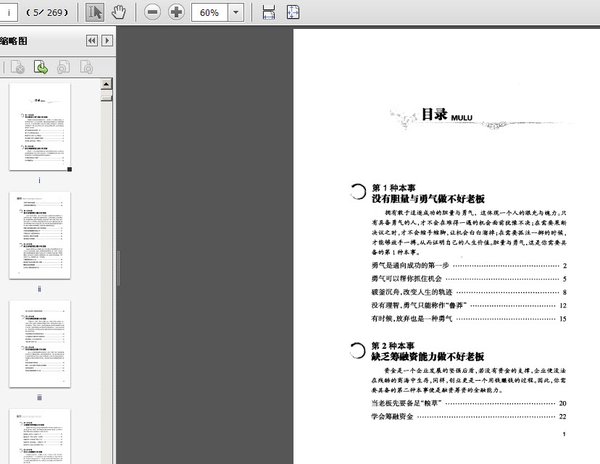 : 第1种本事 没有胆量与勇气做不好老板 拥有敢于追逐成功的胆量与勇气,这体现一个人的眼光与魄力。只有具备勇气的人,才不会在难得一遇的机会面前犹豫不决;在需要果断决议之时,才不会缩手缩脚,让机会白白溜掉;在需要孤注一掷的时候,才能够放手一搏,从而证明自己的人生价值。胆量与勇气,这是你需要具备的第1种本事。 勇气是通向成功的第一步 勇气可以帮你抓住机会 破釜沉舟,改变人生的轨迹 没有理智,勇气只能称作“鲁莽” 有时候,放弃也是一种勇气 第2种本事 缺乏筹融资能力做不好老板 资金是一个企业发展的坚强后盾,若没有资金的支撑,企业便没法在残酷的商海中生存,同样,创业更是一个用钱赚钱的过程。因此,你需要具备的第二种本事便是融资筹资的金融能力。 当老板先要备足“粮草” 学会筹融资金 风投不是洪水猛兽 远离危险的融资误区 第3种本事 缺乏市场洞察力做不好老板 正如一位伟人所说,一些人之所以成功,不是因为他们足够幸运,而是因为他们有一双慧眼,善于捕捉机会罢了。在商业领域,成功需要机遇,而所谓的商机,就是市场的需求。谁先发现了需求,创造了需求,或是培养、诱发了人们的需求,将尚在隐形的产品大众化,谁就是成功者,就是引领市场热点的行业先驱。因此,第3种本事,就是你需要学会洞悉市场,拥有了敏锐的市场洞察力,你就是商业领域的佼佼者。 洞察力就是能发现别人看不到的商机 市场的前景隐藏在信息之中 市场的空白,就是你的机会 抓住热点,商机尽在掌握 看到危机中的商机 第4种本事 缺乏市场营销力做不好老板 俗话说,皇帝的女儿不愁嫁。但是,作为老板,你却是需要为自己卖不出去产品而犯愁的。的确,从管理到决策到资金,这一切的一切其实都是为营销而服务的,最终产品卖不出去,所有努力也就白费。市场营销能力,这也许是15种能力中最重要的一种,无论什么样的老板,只有卖得出产品,才能算得上是一个好老板。 不懂营销还创什么业 给你的产品在市场中找个位置 懂得运用品牌战略 让所有人都知道你的产品 想方设法吸引消费者的眼球 第5种本事 没有战略思维做不好老板 下围棋,走一步看一步的人是庸手,走一步看三步的人是高手,走一步看十步的人是国手。那些商业领域的“国手”,那些成功的大老板,无一例外都是走一步看十步的人,这就是战略思维,这就是你需要学习的第5种本事。战略思维能力决定着你是否有资质成为一个真正成功的老板,战略思维也正是那些站在商业领域顶端的企业家和普通老板之间最大的差异所在。 单纯的模仿无法帮你取得成功 公司需要在不断变化中取得进步 能屈能伸,公司才能有发展 “想当然”会害了你 第6种本事 没有风险意识做不好老板 过去,人们常常将经商创业称作是“下海”。所谓“下海”,其实指的就是创业当中所蕴涵的风险。既然风险客观存在,那么我们就应该正视它;既然风险是我们创业之路上的重要敌人,那么我们就应该重视它。再得意也不要忘记商场中的风险,风险意识是你必须要偷学的第6种本事。 害怕风险就不要创业 拥有一双从风险中发现机会的慧眼 保持忧患意识 把创业风险控制在手心里 第7种本事 不懂细节管理做不好老板 掌握细节的力量,这也是你必须学会的第7种本事。中国有句古话:千里之堤,溃于蚁穴。事实上,细节管理决定着企业的核心竞争力,也正是细节管理,能够让你的公司脱颖而出,变得与众不同。 提高核心竞争力,从细节入手 赢利细节:不要小看每一分利润 质量细节:打造你的“拳头产品” 创新细节:多动动脑,一切都会不一样 服务细节:在细小处征服客户的心 第8种本事 没有人脉圈做不好老板 中国有句古话叫做“一个篱笆三个桩,一个好汉三个帮。”西方有句名言是这样说的:“一个人能否成功,不在于你知道什么,而在于你认识谁。”中西方文化在这里产生了一个交集,无论是中国人还是西方人,都十分重视人脉的重要作用。所以,构筑自己的人脉圈,这是你要偷学的第8种本事。 拥有好人脉,才有好机遇 找到适合自己的“队伍” 要懂得如何建立和维护自己的人脉 要处理好社会关系 同行未必是冤家 坦诚合作,追求双赢 第9种本事 缺乏财务管理能力做不好老板 在一家公司中,财务管理虽然不能代替生产和营销,但是却可以切实地提高公司的效益。如同木桶能装多少水是由桶上面最短的那块木板决定的一样,一个公司要想正常运作,首先就要保证财务方面不出差错。如果你不想让公司里的资金莫名其妙地流失,就一定得学会这第9种本事--财务管理,理清了公司的财务,也就疏通了公司的血脉。 管好你的钱口袋 投资忌盲目 节流和开源同样重要 催账也是门学问 第10种本事 不懂时间管理做不好老板 金钱是宝贵的,于是世界上有无数人整天把理财这个词挂在嘴边,希望自己的财产能够升值。时间同样是宝贵的,但是,世界上又有多少人真正懂得时间管理的重要性?作为一个老板,你的公司越发展,你的时间就越不够用,你就越需要管理好自己的时间。作为一个老板,你要明白你的员工工作效率越高,公司运营的成本就越低。这第10种管理时间的本事所管理的不仅仅是时间,更是金钱和效益。 别拿时间不当钱花 节约时间,为公司创造效益 事有缓急,提高效率才能节约时间 做正确的事才是最有效的时间管理 第11种本事 没有抗压力做