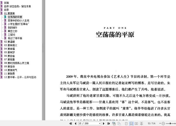 : 我的价值观 自序 一、要简单 空荡荡的平原 艰苦的财富 往事悲催 印在心里的端午 黄豆情结 童年的三个疑问 饥饿的记忆 二、要温暖 老家、老井 陇海线上的悲欢 故乡疏离 印象中的县城 永远解不开的结 坟前的石榴花 男人间的沉默与坚强 三、要有情义 披荆斩棘,共赴未来 挚友易小迪 彪悍王功权 老大哥冯仑 十年再聚首 大艺术家任志强 革命家王石 李敖和陈文茜 四、要幸福 两个世界的人 冲突至绝望 幸福是一致的价值观 分歧在教育 幸福的光 五、要有梦 你幸福吗 消除自我,实现理想 先知与逻辑 可期的美丽新世界 新民主 新秩序 六、要思索 自我是魔鬼 杂碎和牛排 爱,再多一些 初见赵青 娶媳妇的恶梦 那些语言无法表达的存在 享受孤独 七、要慈善 义务教育? 全世界的教育方式都落后了 美德教育 慈善的动机 环保的初衷 PM2.5背的故事 八、要擦亮自己的心灵之镜 精神不朽之道 孪生兄弟怎么平衡? 身体与灵魂的镜像 心与光明的源泉 诚实永远不会太多 每个人内心都有一颗种子 没有谁比谁更重要 团结的新意 爱心与市场无关 九、要信仰 谁的世界谁的心 信仰的维度 儒教是宗教吗 宗教与科学的殊途同归 阳光来自同一太阳 灵魂的自由新世界 心如何踏实 经济的本质是精神的 我的信仰之路 相信科学 敬畏神圣 十、要接地气 草长得再快也成不了材 商之灵魂 阳光的哲学 经济危机在考验什么? 公司存在的意义 税收、产品与精神财富 不易复制与不能复制 十一、要敬畏 究竟是什么影响了房价? 癌症一样的地产业 扬汤止沸的调控 房价的逻辑 中长短期调控的艺术 信或不信:市场之惑 思维的伸展 十二、要平等、公平、公开与互动 释永信的忧和任志强的喜 房地产销售要拜微博为师 信仰与道德重建的原动力 放充定价权的真相 透明的价值 网上网下的差异 线上、线下的结合 在互联网上敞开大门 ..